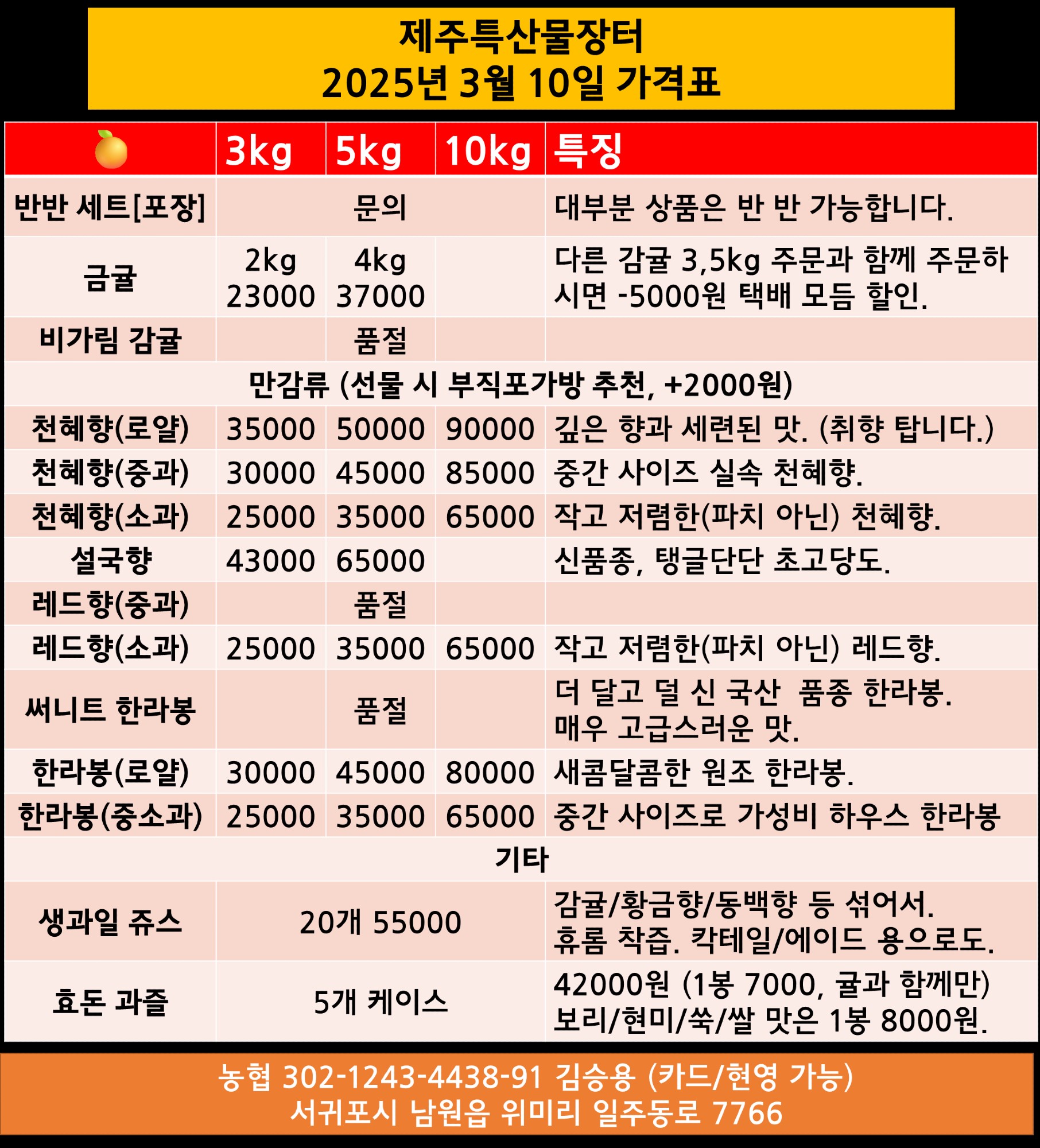 3월 10일 임시 가격표입니다. 써니트는 최후의 최후 입고가 있을지도 모릅니다. 설국향은 조금 더 익기를 기다리는 중. 주문 : tinyurl.com/jejuorange7766 (구글폼) 문의 : open.kakao.com/o/snBLcewf (오픈카톡)