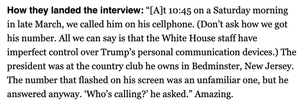 ![How they landed the interview: “[A]t 10:45 on a Saturday morning in late March, we called him on his cellphone. (Don’t ask how we got his number. All we can say is that the White House staff have imperfect control over Trump’s personal communication devices.) The president was at the country club he owns in Bedminster, New Jersey. The number that flashed on his screen was an unfamiliar one, but he answered anyway. ‘Who’s calling?’ he asked.” Amazing.](https://media.mstdn.social/media_attachments/files/114/417/920/410/783/467/original/d37c1ea1cfddb2bf.png)