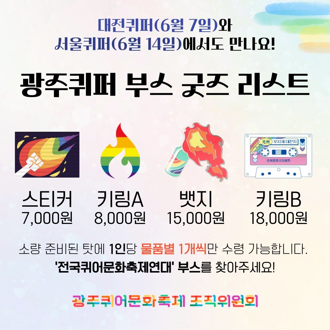 [텀블벅 굿즈, 빵퀴와 서퀴에서도 만나요!] 후원 리워드 물품 리스트 : 스티커, 키링 2종, 금속뱃지 *극소량 준비된 탓에 1인당 물품별 1개씩만 수령 가능합니다. *'전국퀴어문화축제연대' 부스를 찾아주세요! *후원 방식은 계좌이체만 가능하다는 점 양해 부탁드립니다.