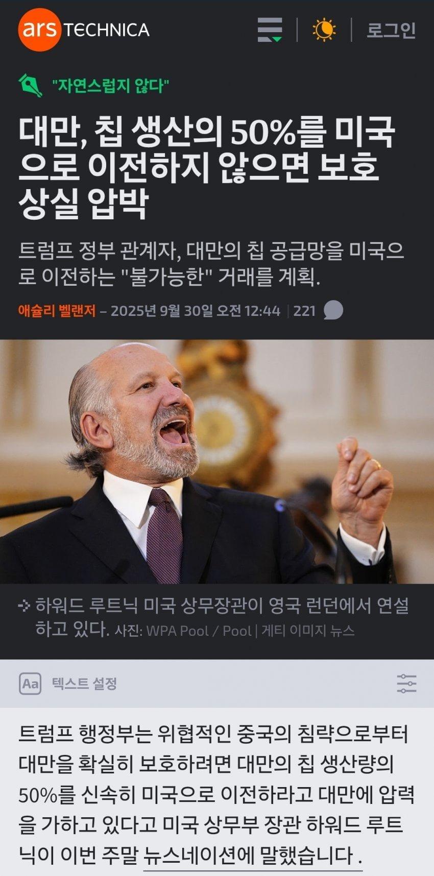 러트닉:대만은 보호받고 싶으면 칩생산량의 절반을 넘겨라
