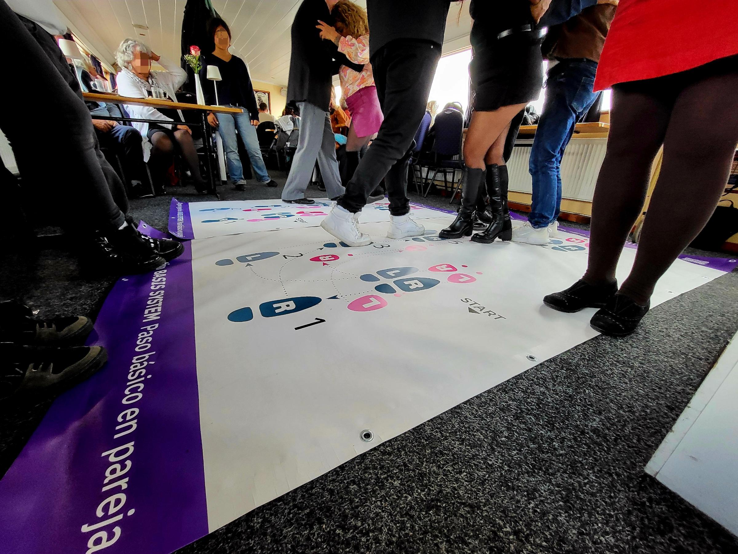 An Bord eines Schiffes unter Deck: ein tanzendes Paar in Bildmitte. Drumherum schauen interessierte Personen stehend und sitzend dem Tanzpaar zu. Ihre Gesichter sind unkenntlich gemacht. Fenster zur linken und rechten Bildseite geben den Blick auf ein Gewässer frei.An Bord eines Schiffes unter Deck: Mehrere Personen versuchen sich in die Schritte des Tangotanzes. Man sieht viele Beine. Gesichter sind unkenntlich gemacht. Am Boden eine Plane, auf der Fußschritte in blau und rosa markiert sind mit Buchstaben "R" für rechts und "L" für links.