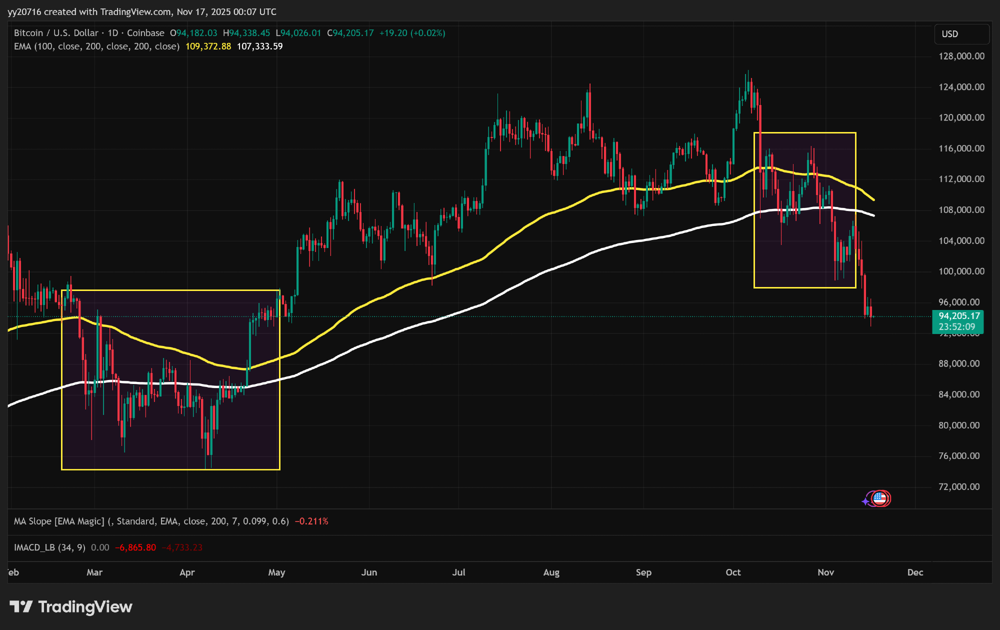 여기서 하얀선이 200일선이고 3-4월쯤엔 200일선을 뚫고올라가려는 공성전이 있었고 이겼고 그래서 가격이 올라갔고 11월쯤에 다시 200일선을 지키려는 공성전이 있었지만 실패해서 뚫려서 무너진것 (..) 주식시장도 조만간 따라가지 않을까 예상합니다;