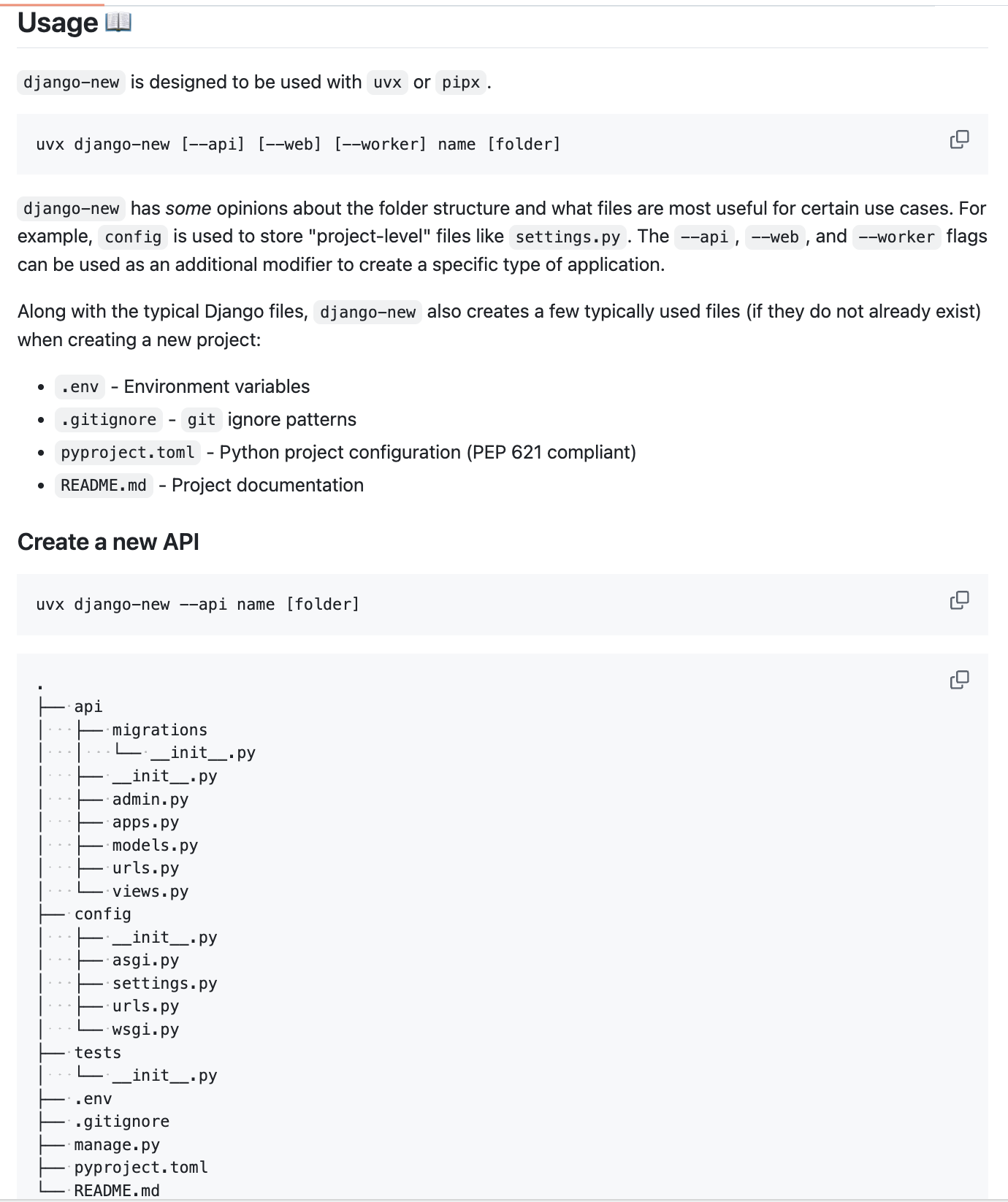 django-new has some opinions about the folder structure and what files are most useful for certain use cases. For example, config is used to store "project-level" files like settings.py. The --api, --web, and --worker flags can be used as an additional modifier to create a specific type of application.