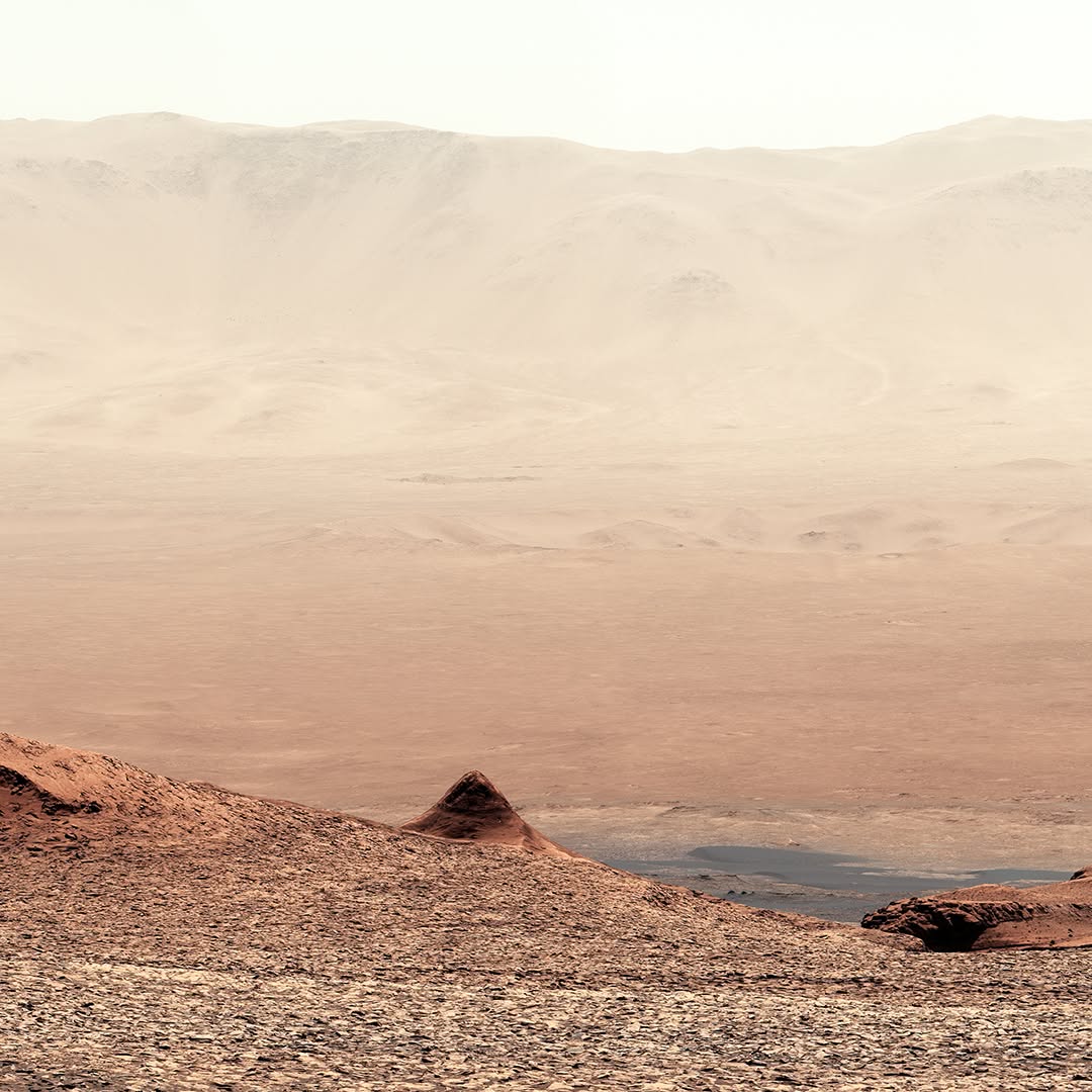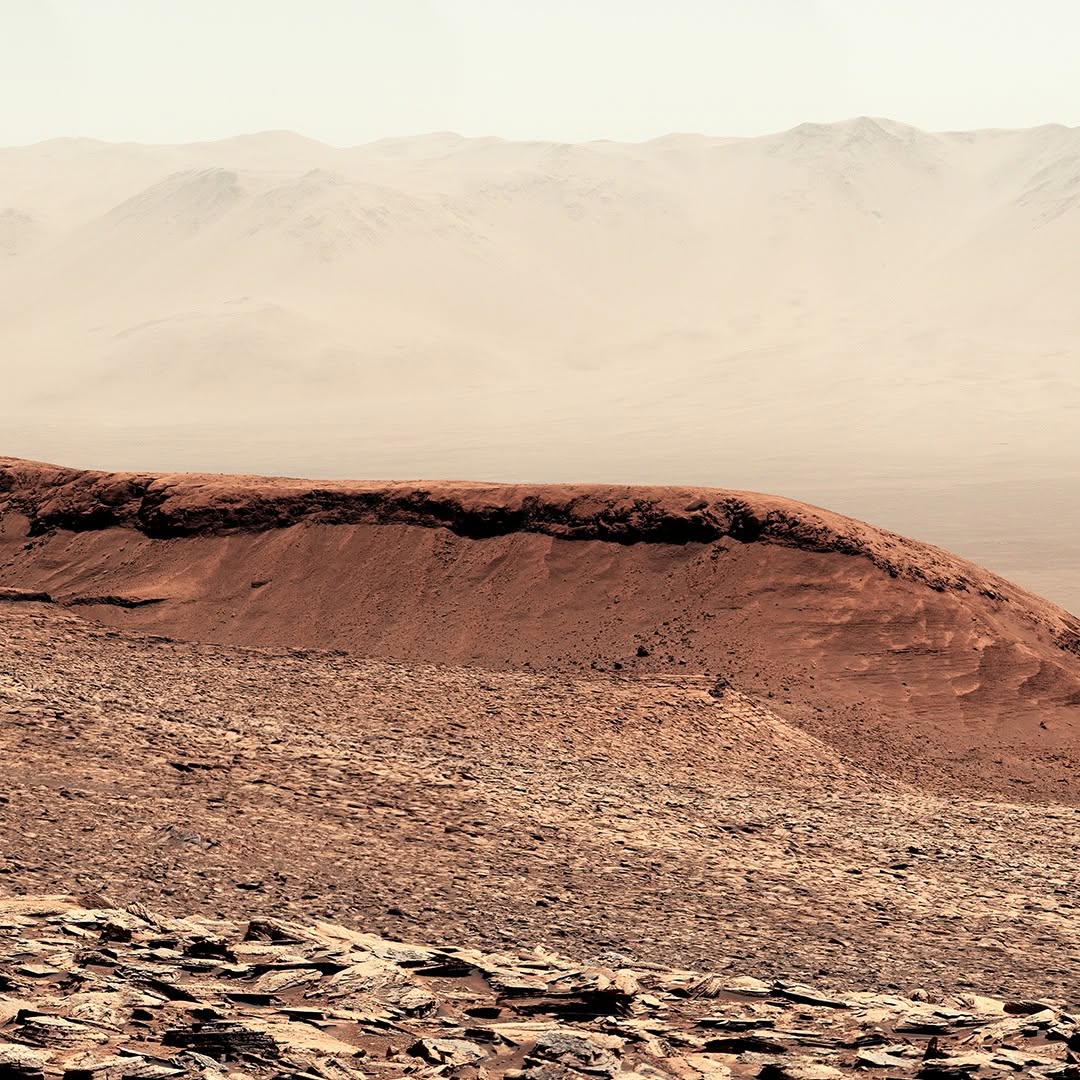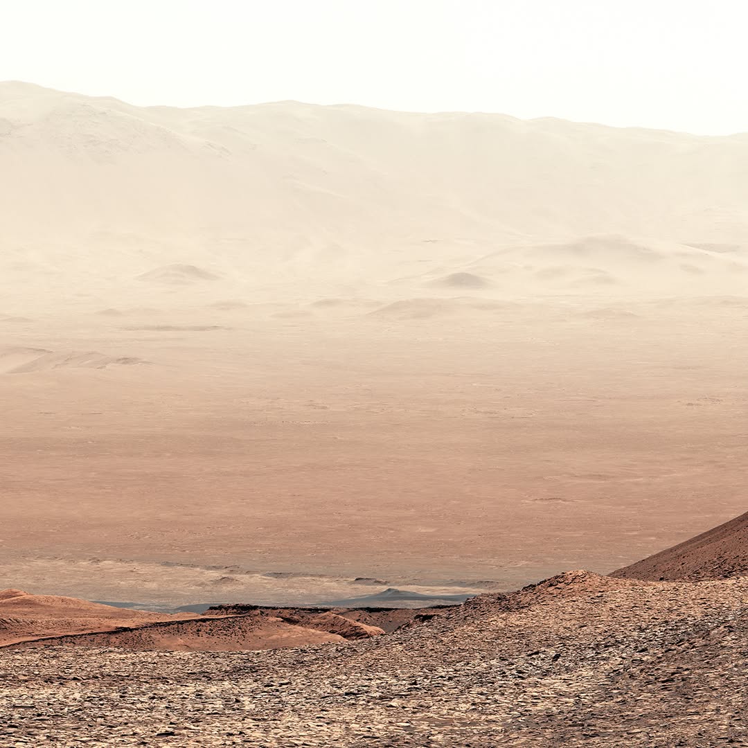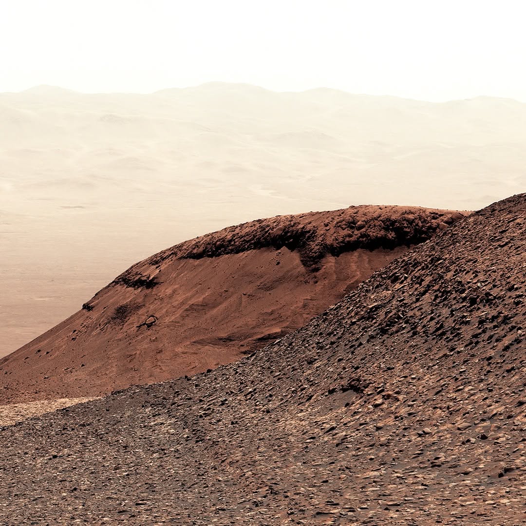 Curiosity captured this view on Feb. 7, 2025, as it climbed Mount Sharp, a 3-mile-tall mountain made up of layers which formed in different eras of Martian history. By studying each layer, Curiosity's scientists can learn more about how the planet's environment changed over time from a warmer, wetter, and more Earthlike world to the freezing desert it is today. This view looks back down from the slopes of Mount Sharp into Gale Crater.