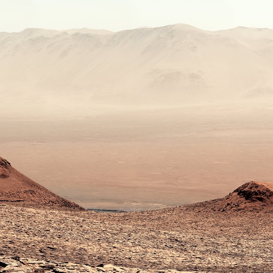 Image description: A very wide panorama, split into several images, shows off a rocky Martian landscape. A rippled, reddish-brown surface dominates the foreground, with hilly slopes descending into a flat plain—the surface of Gale Crater. The far wall of the crater can be faintly seen in the distance.