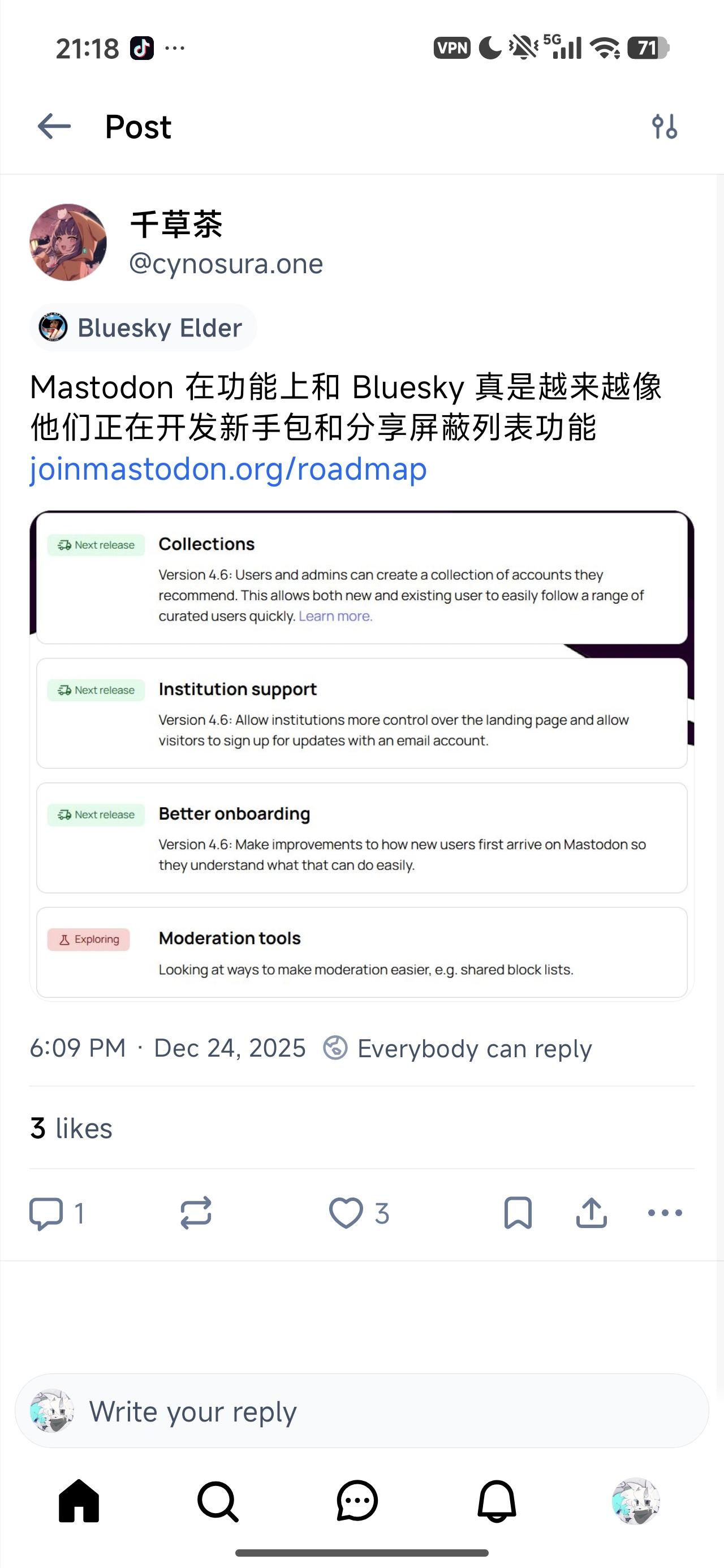![这是社交媒体平台的帖子界面截图。发帖人是“千草茶”([@]cynosura.one),标注“Bluesky Elder”。正文内容为:“Mastodon 在功能上和 Bluesky 真是越来越像 他们正在开发新手包和分享屏蔽列表功能”,下方有链接“joinmastodon.org/roadmap”。帖子下方列出四个功能模块:Collections(Next release,Version 4.6: Users and admins can create a collection of accounts they recommend. This allows both new and existing user to easily follow a range of curated users quickly. Learn more.);Institution support(Next release,Version 4.6: Allow institutions more control over the landing page and allow visitors to sign up for updates with an email account.);Better onboarding(Next release,Version 4.6: Make improvements to how new users first arrive on Mastodon so they understand what that can do easily.);Moderation tools(Exploring,Looking at ways to make moderation easier, e.g. shared block lists.)。帖子时间显示“6:09 PM · Dec 24, 2025”,权限为“Everybody can reply”,显示3个赞,底部有回复、转发、点赞等操作按钮及导航栏图标。