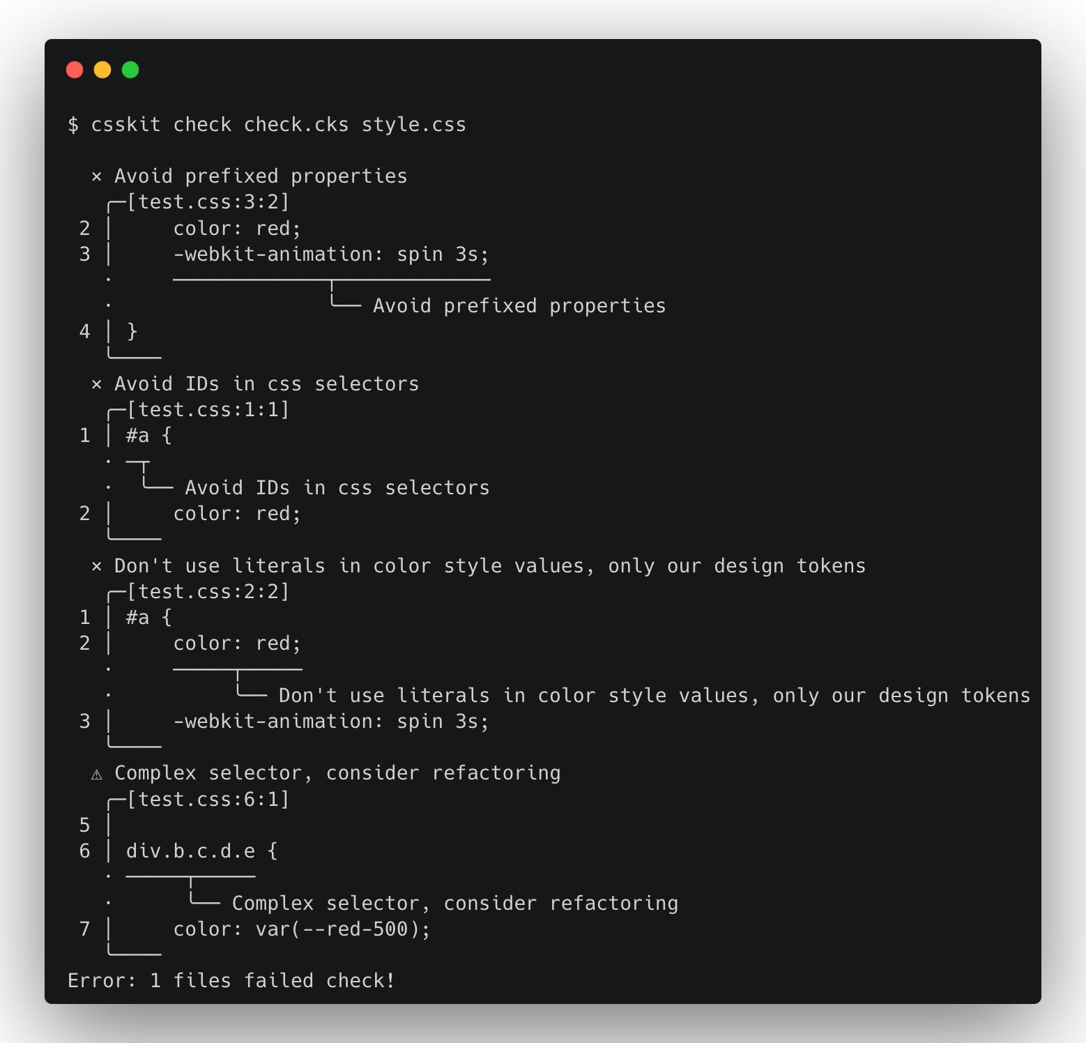 ![A terminal window. The user has run the command `csskit check check.cks style.css` and the result is the following output: