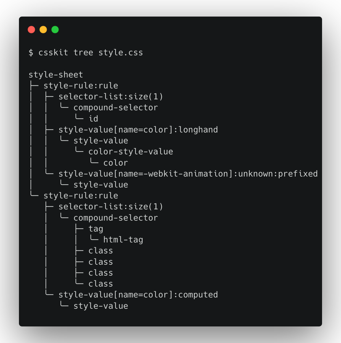 ![A terminal window. The user has run `csskit tree style.css` and the result is the following output: