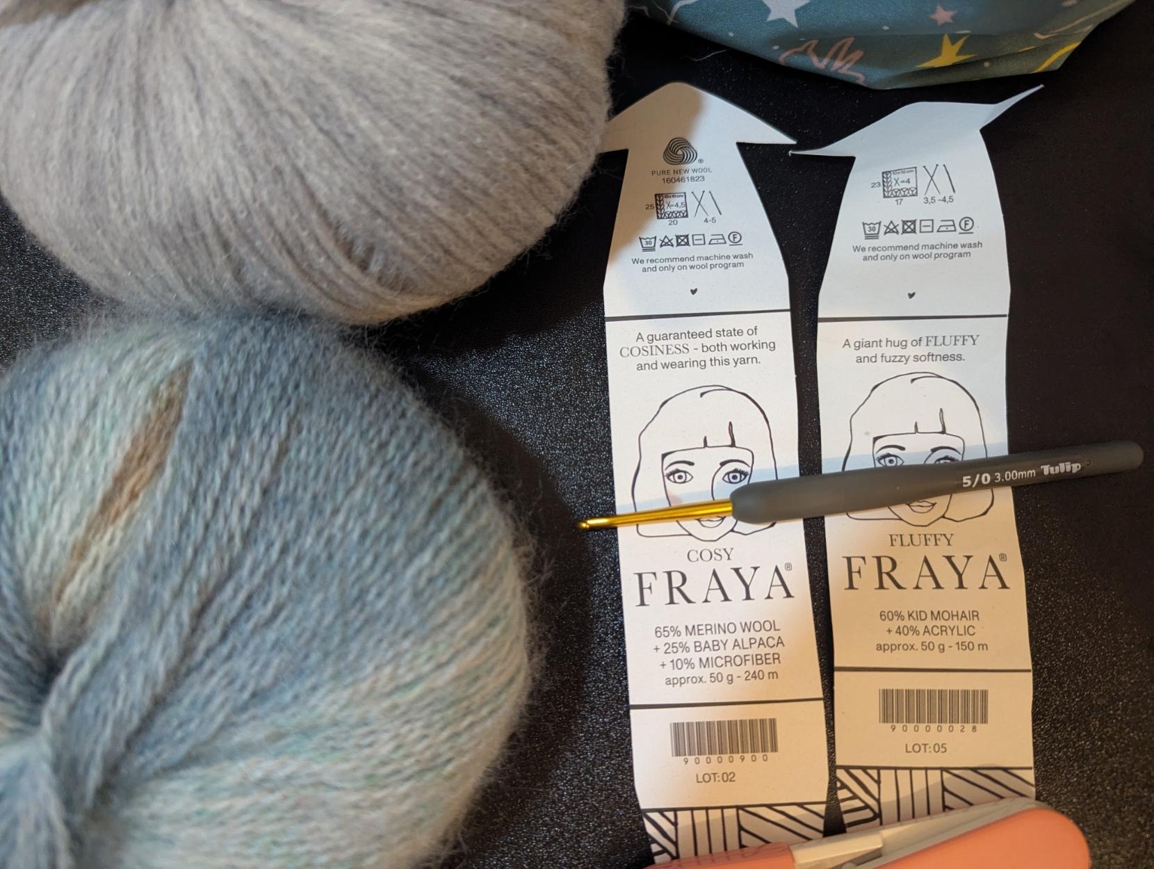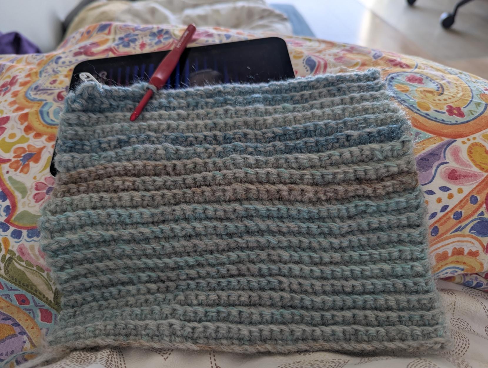 這是我第一次使用馬海毛,這是Gemini建議的,我也剛好找到喜歡的馬海毛線(漸層色的那一球),就試著這樣鉤看看。目前鉤了20cm長,目標是鉤到52cm後縫合成一圈。