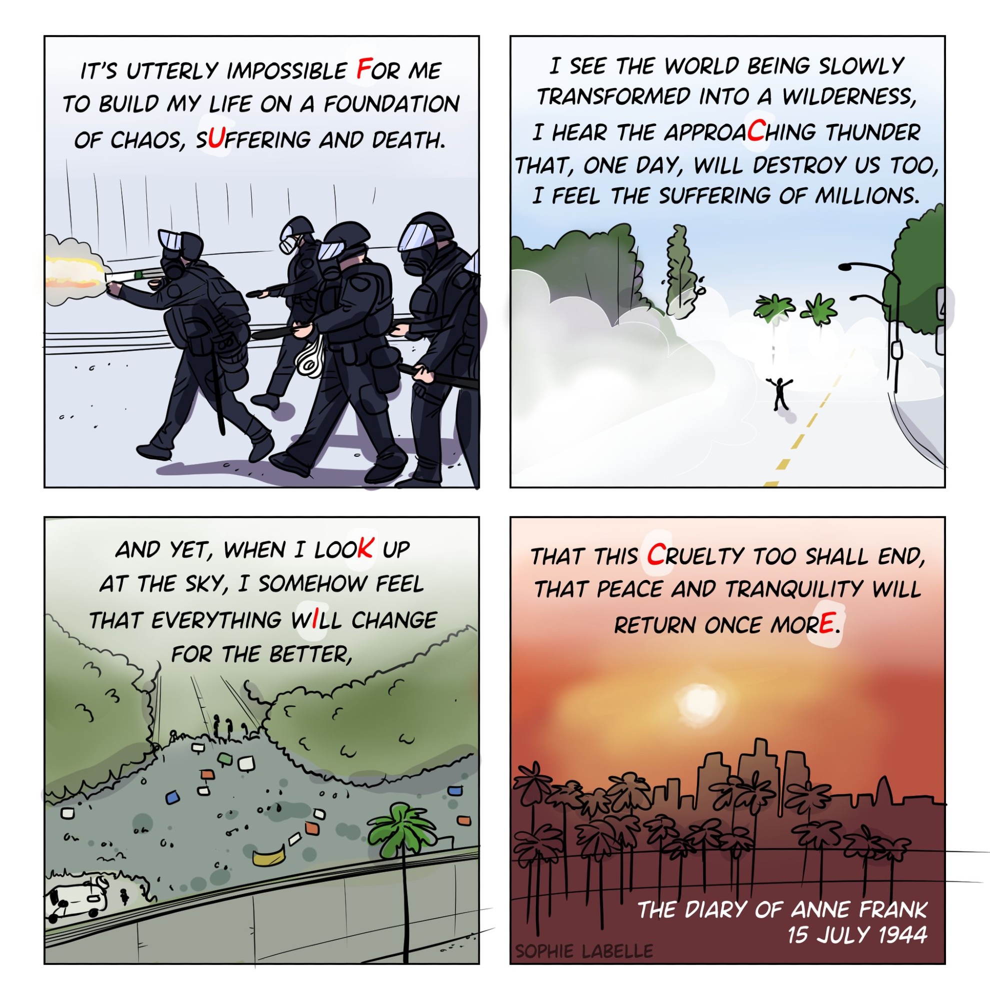 i wake up. the year is 2---. the country i happened to be born in is at war. again. i had no say in the matter, and i will have no say in the next one. i give money to the guy on the street corner. i make some art. i try not to think about the supply chain for each of the material goods that surround me. i manage to not cry. i try not to yell too much in traffic. i wonder how it ends.