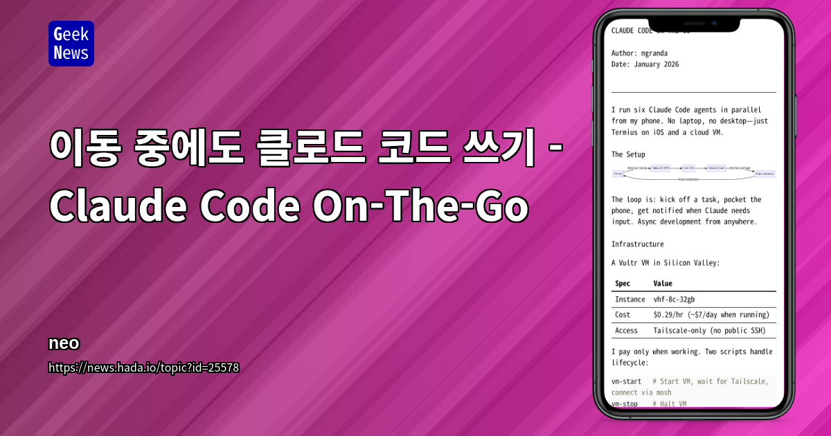 - *스마트폰만으로 6개의 Claude Code 에이전트를 병렬 실행* 하며 개발 작업을 수행하는 구성 설명