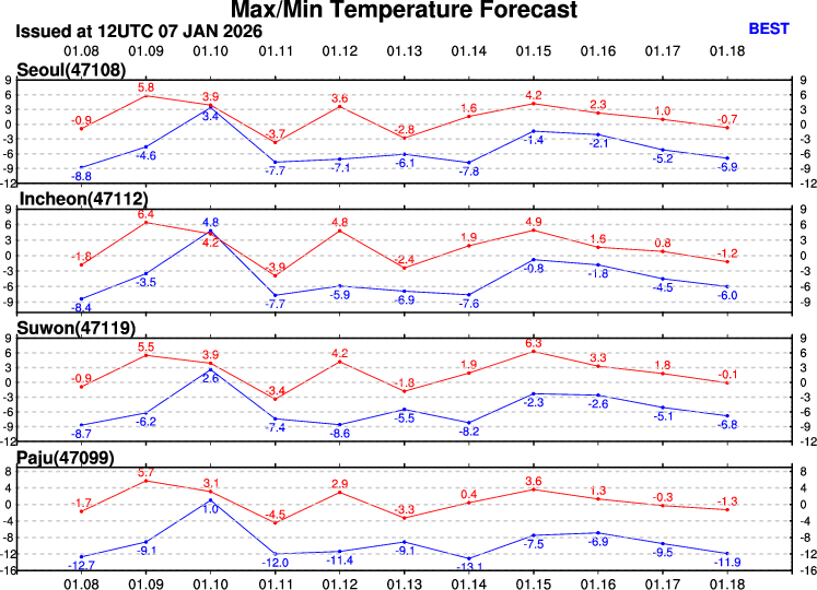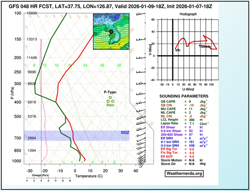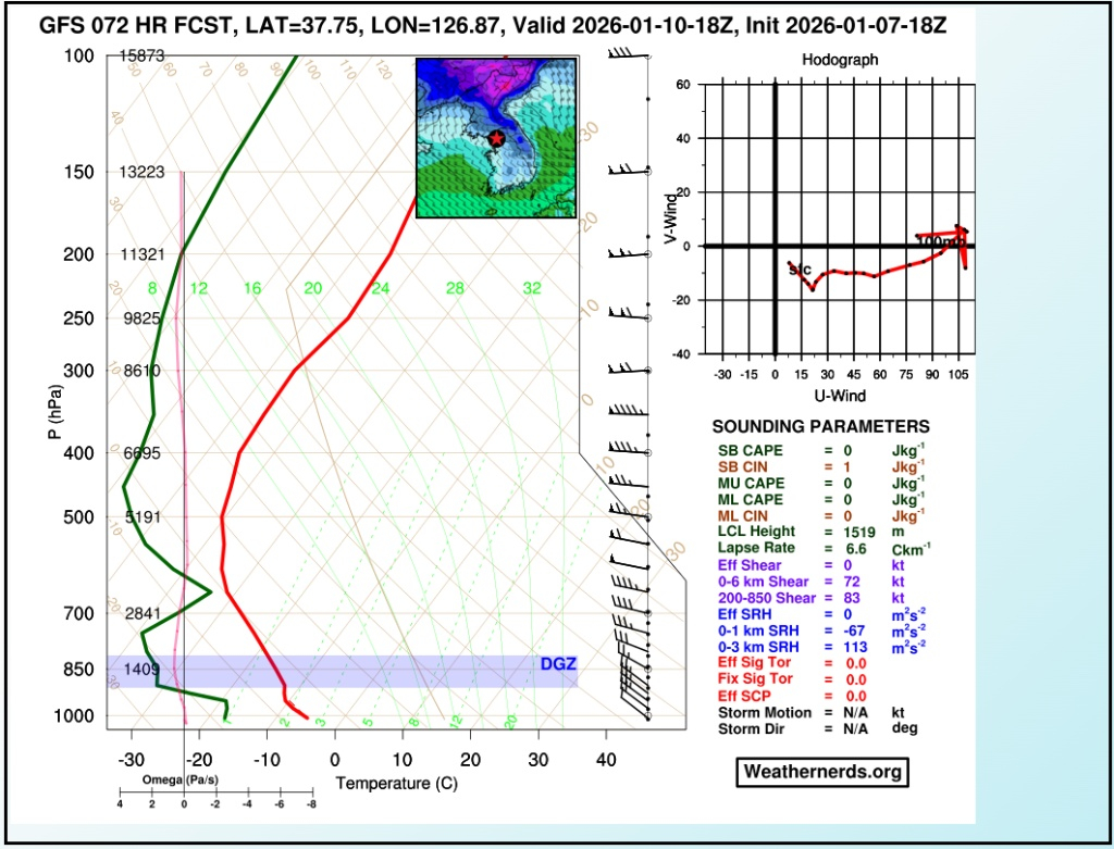 현재 KIM 모델은 일요일 눈을 예상하지만, GFS/ECMWF는 11일에는 눈/비가 멈추고 본격적인 한파에 접어들 것으로 보고 있습니다. 서고동저형 기압 배치가 형성, 전국적으로 매우 강한 북풍이 불 것으로 예상되는데요. 사운딩 차트만 봐도 수도권 지역 지상 온도가 -3~-4℃까지 하락하는 것을 보입니다. 거기다 풍속도 850hPa 영역이 40~45kt까지 증가, 체감 기온은 5~10℃ 이상 내려가겠습니다. 저기압 통과 이후 급락한 기온탓에 도로가 결빙될 가능성이 매우 높아지고 있는데요. 이번 주말 날씨 호락호락하지 않겠네요.