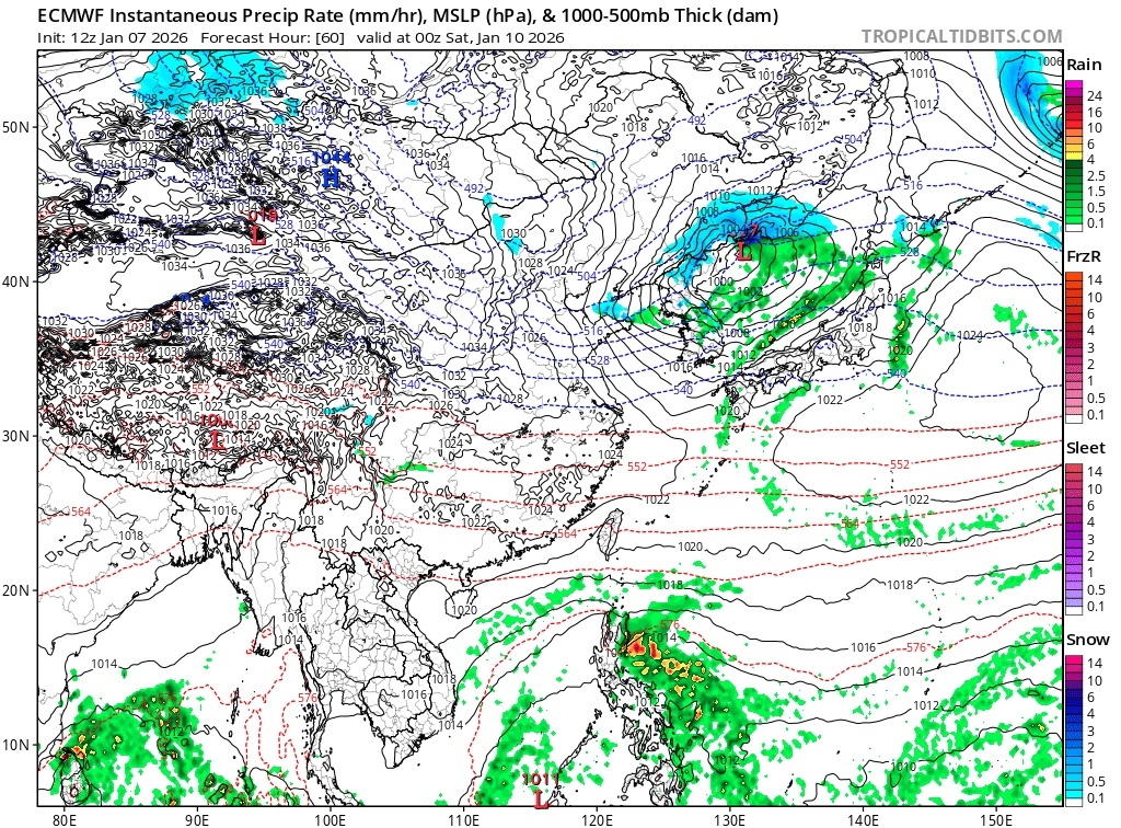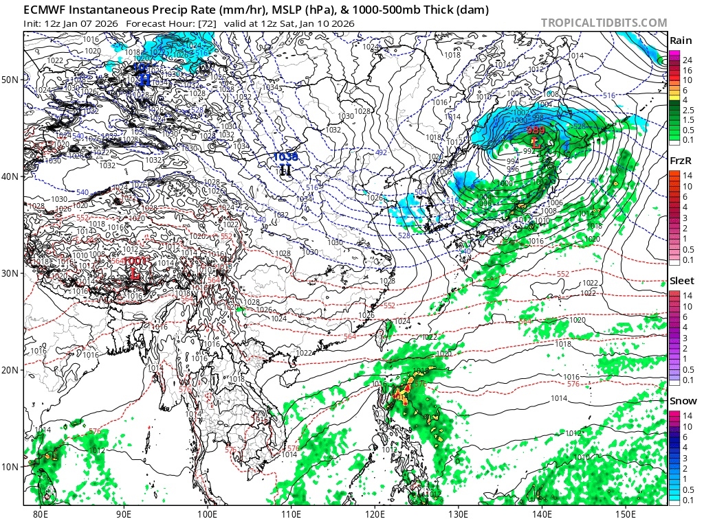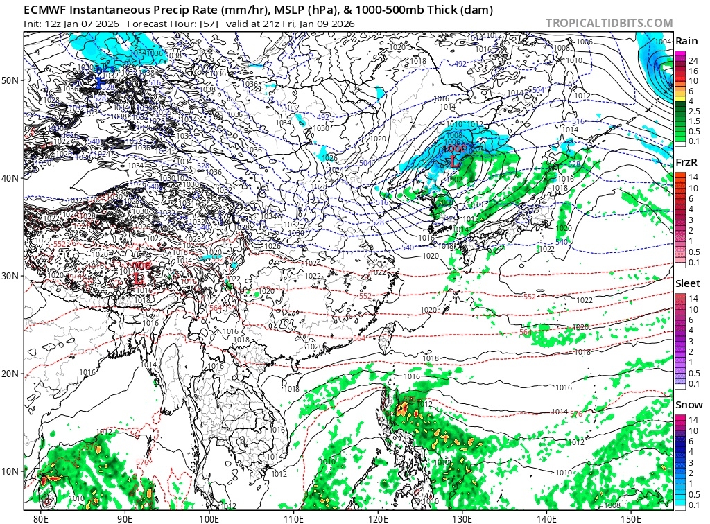 조금 더 자세히 보면 540dam 선이 수도권-강원 북부를 가로지르면서 눈과 비의 경계면을 짓고 있죠. 거기서 3시간 뒤인 (+60hr) 전망치에서는 본격적으로 눈이 내립니다. 저기압의 후면 기온 강하 효과에 의해 눈이 내리는거죠. 540dam 선을 보면 대략적으로 충청 남부-전북 북부 지역까지 눈이 내릴 것으로 예상됩니다. 이는 당초 예상보다 저기압의 남하도, 한기의 남하도 빨라졌기 때문입니다. 강수 구역이 통과하면서 기온이 급락하는 후면 강설 형태라 적설 효율도 높아져서 많은 눈이 내리고 길이 얼어붙을걸로 보입니다.