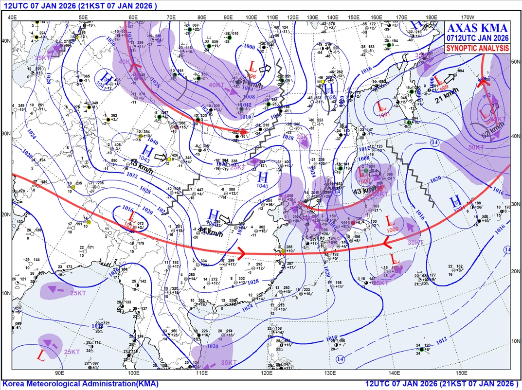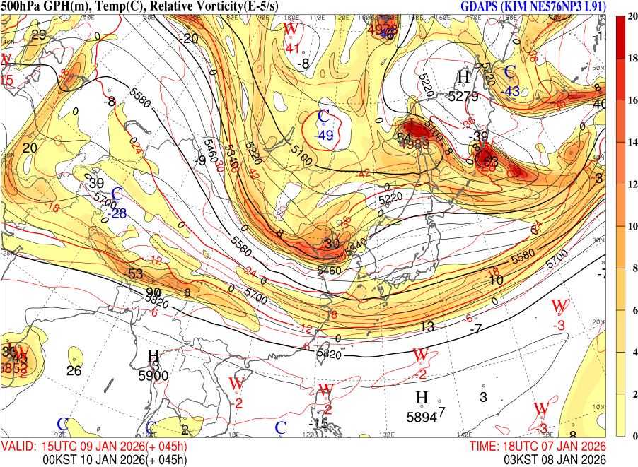 주요 도시별로는 서울 -9~-1℃, 대전 -8~2℃, 대구 -6~2℃, 광주 -4~3℃, 부산 -4~4℃, 제주 3~5℃이며 차가운 바람의 영향으로 인해 미세먼지는 상당히 좋아지겠습니다. 현재 몽고 지방에서 발원하고 있는 저기압이 빠르게 남진하면서 내일 오후 정도부터 한반도에 영향을 끼칠 것으로 보이는데요. 매우 깊고 날카로운 기압골이 형성되는 것이 보입니다. 지도에 표시된 붉은색, 양의 와도 영역은 상층에서 공기를 들어올리는 펌프 역할을 해서 지상 저기압을 급격히 발달시키는데요. 이러면 비나 눈구름이 급격히 발달합니다.