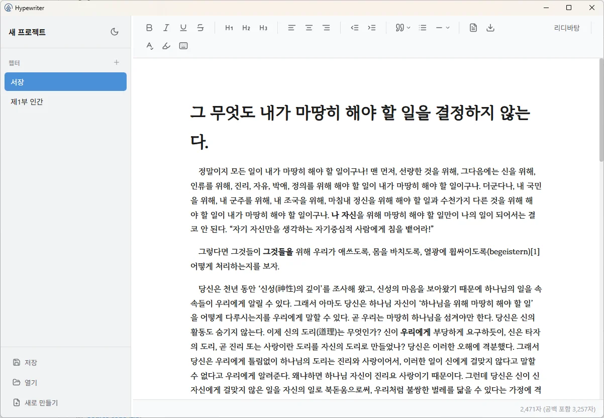 글자수세기, 타자기 모드, 마크다운 문법 일부 지원, 다양한 구분선 및 인용 스타일 등을 지원합니다.