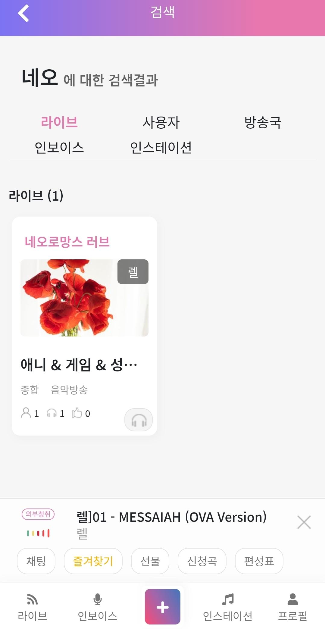 주력은 추억의 애니,게임 음악 등. 앱 상에 검색해서 (검색어 : 네오) 나온 방송 헤더 헤드폰 모양 누르면 음악 나옵니다.