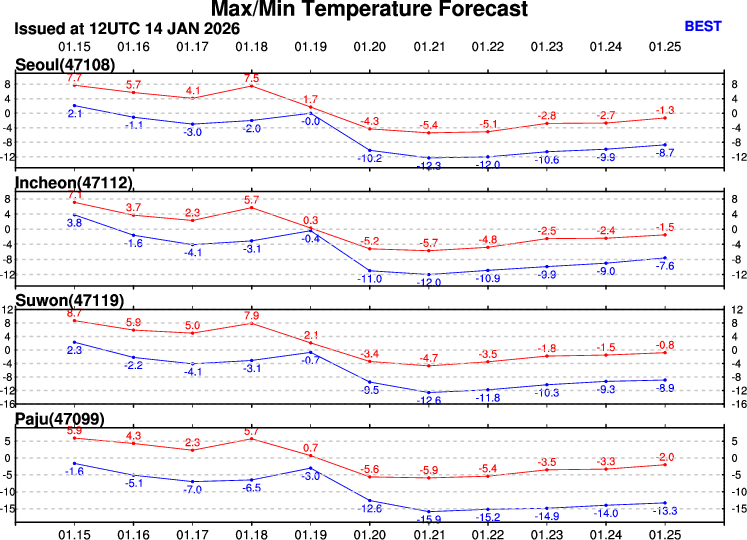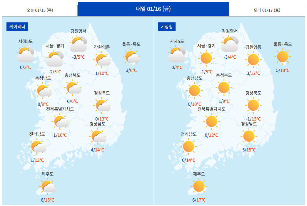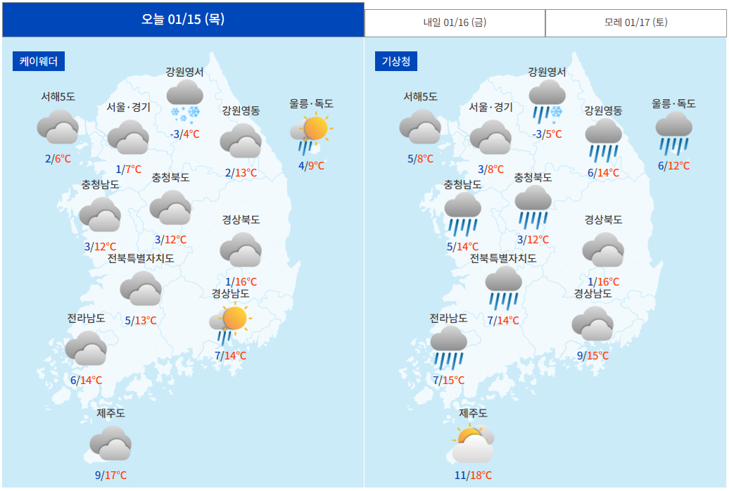 씁쓸한 기분을 뒤로 하고 예보를 이어가보겠습니다. 오늘은 저기압의 영향으로 대체로 흐린 가운데 오후부터 저기압의 영향에서 벗어나며 점차 맑아지겠습니다. 새벽부터 일부 지역에 내린 비는 오전 중 대체로 그치겠습니다. 오늘 아침 최저기온은 -3~10℃로 크게 오르고, 낮 최고기온 역시 5~18℃로 예상됩니다. 주요 도시별로는 서울 3~8℃, 대전 5~13℃, 대구 1~16℃, 광주 6~15℃, 부산 9~15℃, 제주 10~18℃로 예상됩니다. 하지만 이렇게 풀리는 날씨는 곧 끝날걸로 예상됩니다. 우려한대로 진짜가 오기 때문입니다.