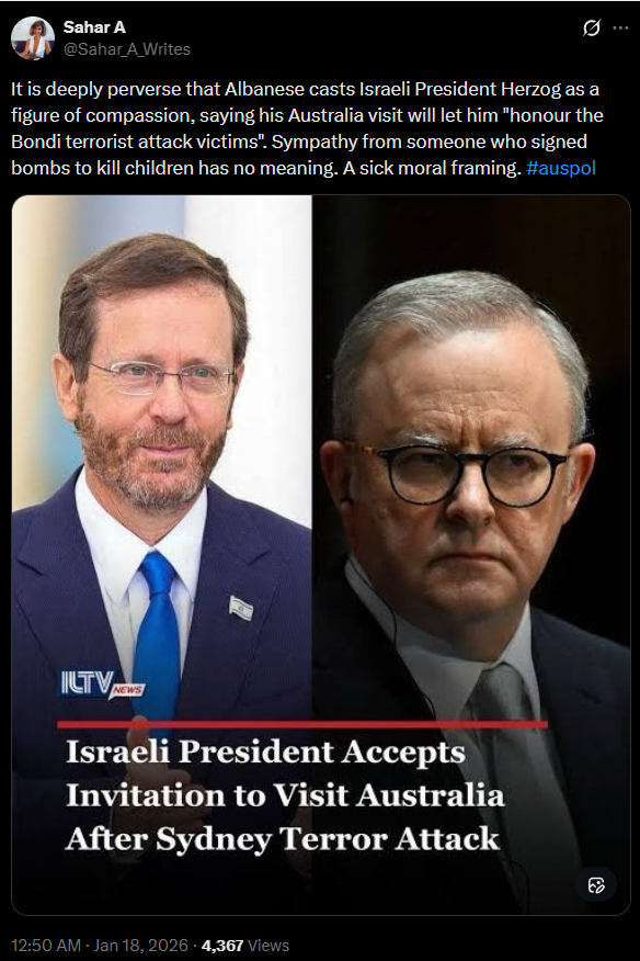 It is deeply perverse that Albanese casts Israeli President Herzog as a figure of compassion, saying his Australia visit will let him "honour the Bondi terrorist attack victims". Sympathy from someone who signed bombs to kill children has no meaning. A sick moral framing. #auspol