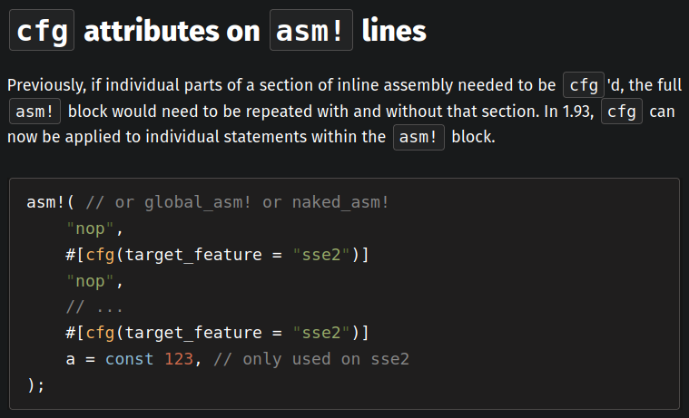 Previously, if individual parts of a section of inline assembly needed to be cfg'd, the full asm! block would need to be repeated with and without that section. In 1.93, cfg can now be applied to individual statements within the asm! block.