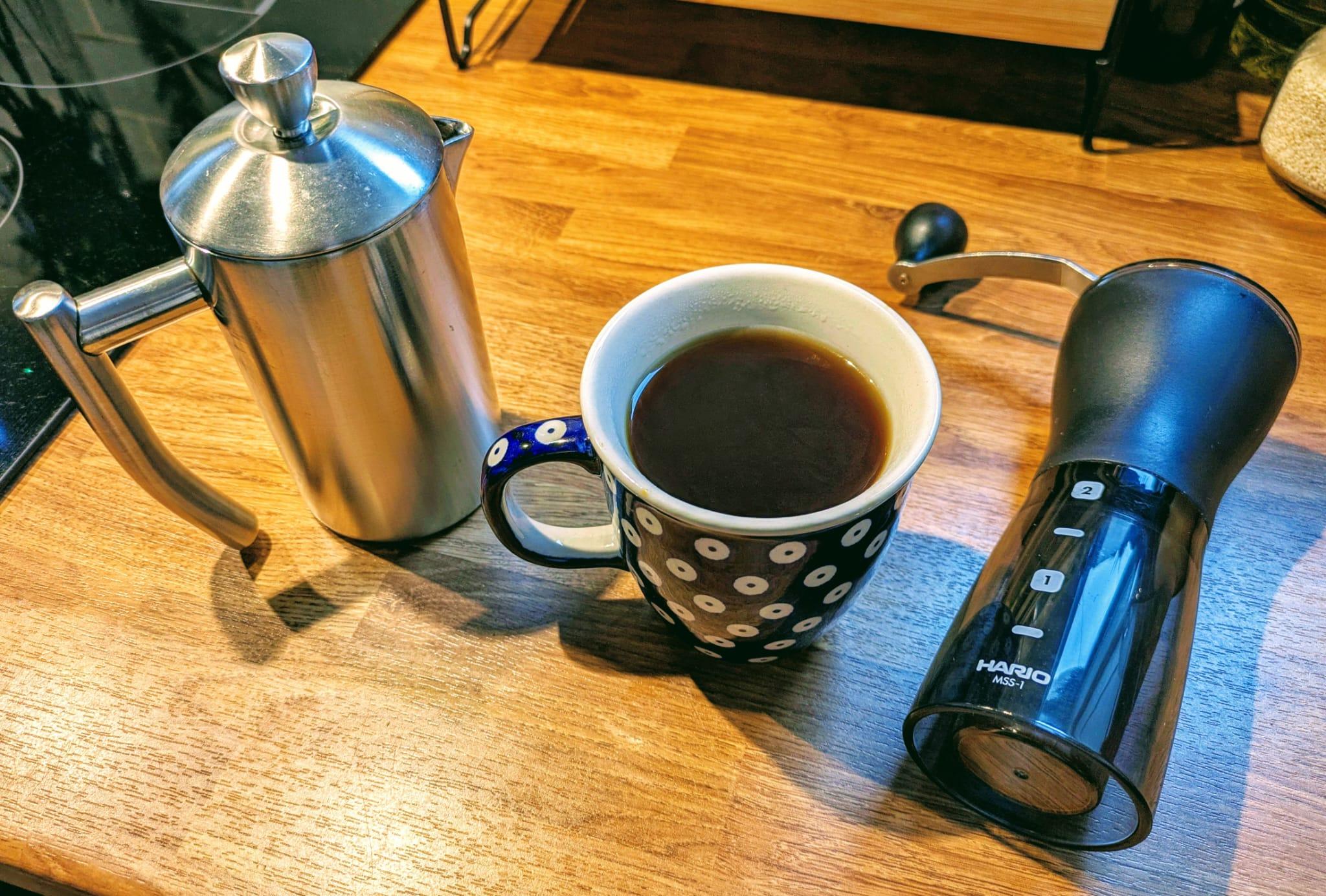 A stainless steel french press, a cup of black coffee, and a hand-crank coffee grinder on a wooden kitchen counter top.