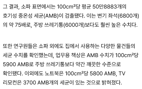 또한 연구원들은 소파 외에도 집에서 사용하는 다양한 물건들의 세균 수치를 확인했는데, 업무용 책상은 AMB 수치가 100cm²당 5900 AMB로 주방 쓰레기통보다 약간 깨끗한 수준으로 확인됐다. 이외에도 노트북은 100cm²당 5800 AMB, TV 리모컨은 3700 AMB개의 세균이 있는 것으로 밝혀졌다.같은 기사 발췌:
