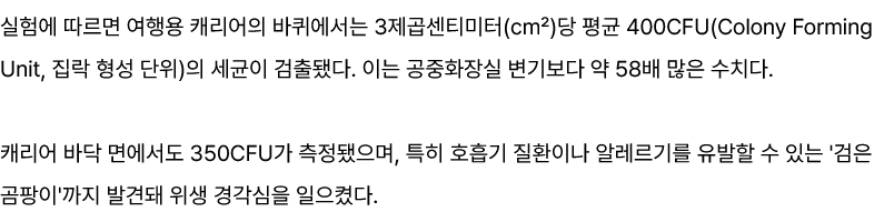 캐리어 바닥 면에서도 350CFU가 측정됐으며, 특히 호흡기 질환이나 알레르기를 유발할 수 있는 '검은 곰팡이'까지 발견돼 위생 경각심을 일으켰다.아시아경제의 2025년 11월 21일 기사 '매일 입에 닿는데 세균·곰팡이 '범벅'…변기보다 3000배 더러운 전자담배' 발췌: