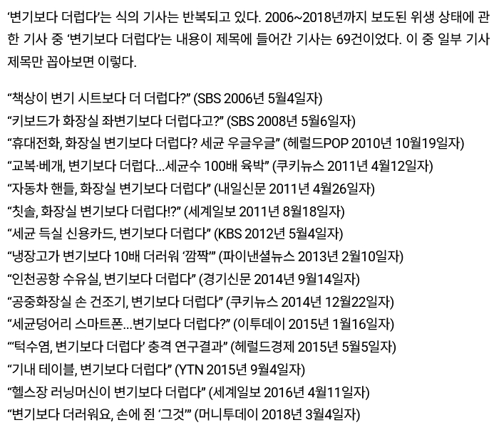 인용한 기사에서 보인 흥미로운 사실들... * 공통적으로 모 '연구팀'의 '연구'나 '실험'을 인용하지만 제대로 인용은커녕 DOI나 링크라도 단 기사는 하나도 없습니다. disappointed but not surprised * 헤럴드경제의 두 기사는 같은 기자가 썼습니다. * 단위 면적당 CFU를 쓴 기사가 3개 있는데, 1변기를 CFU/cm²로 역산해보면 76.7 vs 2.30 vs 7.75 등 제각각입니다.