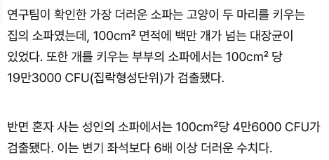 연구팀이 확인한 가장 더러운 소파는 고양이 두 마리를 키우는 집의 소파였는데, 100cm² 면적에 백만 개가 넘는 대장균이 있었다. 또한 개를 키우는 부부의 소파에서는 100cm² 당 19만3000 CFU(집락형성단위)가 검출됐다.