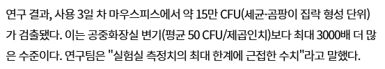 연구 결과, 사용 3일 차 마우스피스에서 약 15만 CFU(세균·곰팡이 집락 형성 단위)가 검출됐다. 이는 공중화장실 변기(평균 50 CFU/제곱인치)보다 최대 3000배 더 많은 수준이다. 연구팀은 "실험실 측정치의 최대 한계에 근접한 수치"라고 말했다.