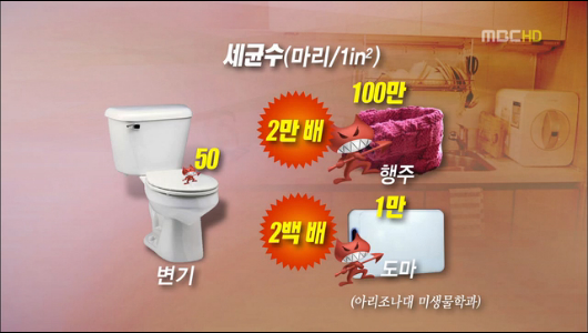 MBC의 2012년 11월 24일 기사 '변기보다 더러운 수세미·행주‥'세균의 온상' 주방' 발췌: