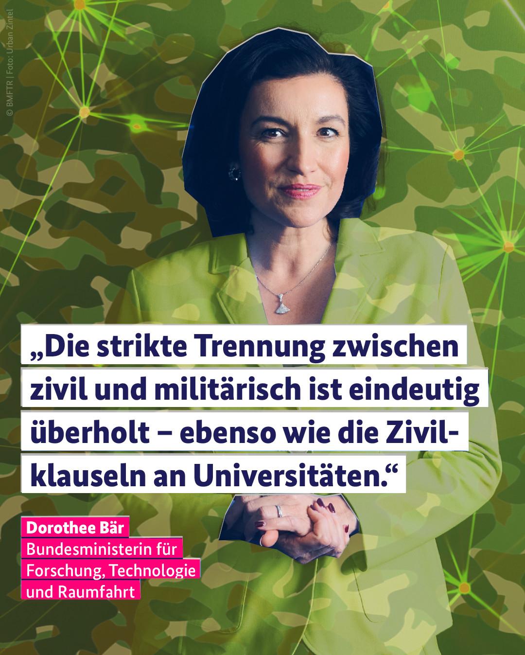 Ministerin (BMFTR) Dorothee Bär sagt: „Die Trennung zwischen ziviler und militärischer Forschung ist überholt – ebenso wie die Zivilklauseln an Universitäten.“ Das offizielle Bild wurde von uns künstlerisch leicht verfremdet.