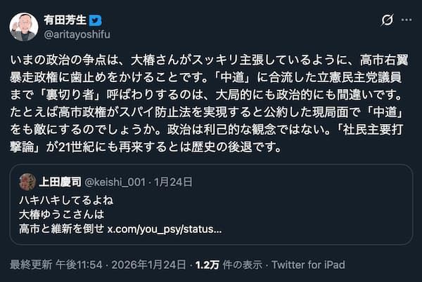 有田芳生のtwitterでの2026/1/24 11:54の投稿