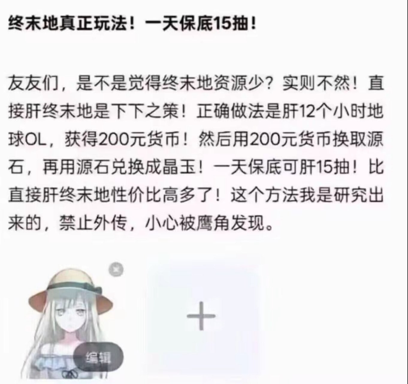 @adminKipJayChou 一个社交媒体帖子,包含一个用户徽标、中文文字内容以及插图。用户徽标显示着红、黄、蓝色的圆圈,配有“dwn 2026”和一个德文旗帜的表情符号。帖子标题为“终末地真正玩法!一天保底15抽!”,随后内容解释了一个涉及“肝12小时地球OL”的游戏方法,即“工作12小时地球OL” (在地球OL中工作12小时), “200元货币” (200元货币), “源石兑换” (源石兑换) 以及“一天保底可肝15抽” (15日保底可肝15抽)。 下面是人物的插图,头戴帽子,配有“编辑”按钮。在右侧,同样内容重复,底部添加了更多文本。由[@]altbot 提供,使用Qwen3-Vi-30b 在本地私密生成。