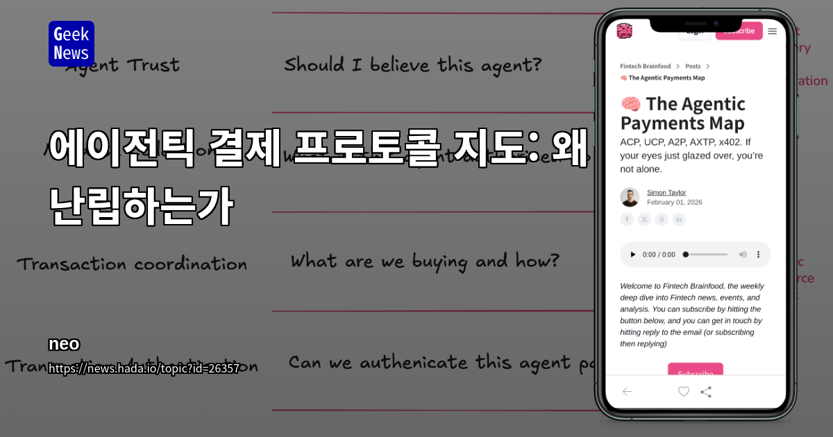 에이전틱 결제 프로토콜 지도: 왜 난립하는가 ------------------------------ - AI 에이전트가 자율적으로 구매·지불·정산을 수행하기 위해 *여러 결제 프로토콜이 병렬적으로 등장* 하고 있음 - ACP, UCP, AP2, x402 등은 모두 결제를 다루지만, *상거래·B2B·에이전트 간 결제* 처럼 *서로 다른 문제 영역* 을 겨냥함 - 인터넷은 본래 *정보 전달* 을 목적으로 설계되어 *결제 계층이 존재… ------------------------------ https://news.hada.io/topic?id=26357&utm_source=googlechat&utm_medium=bot&utm_campaign=1834