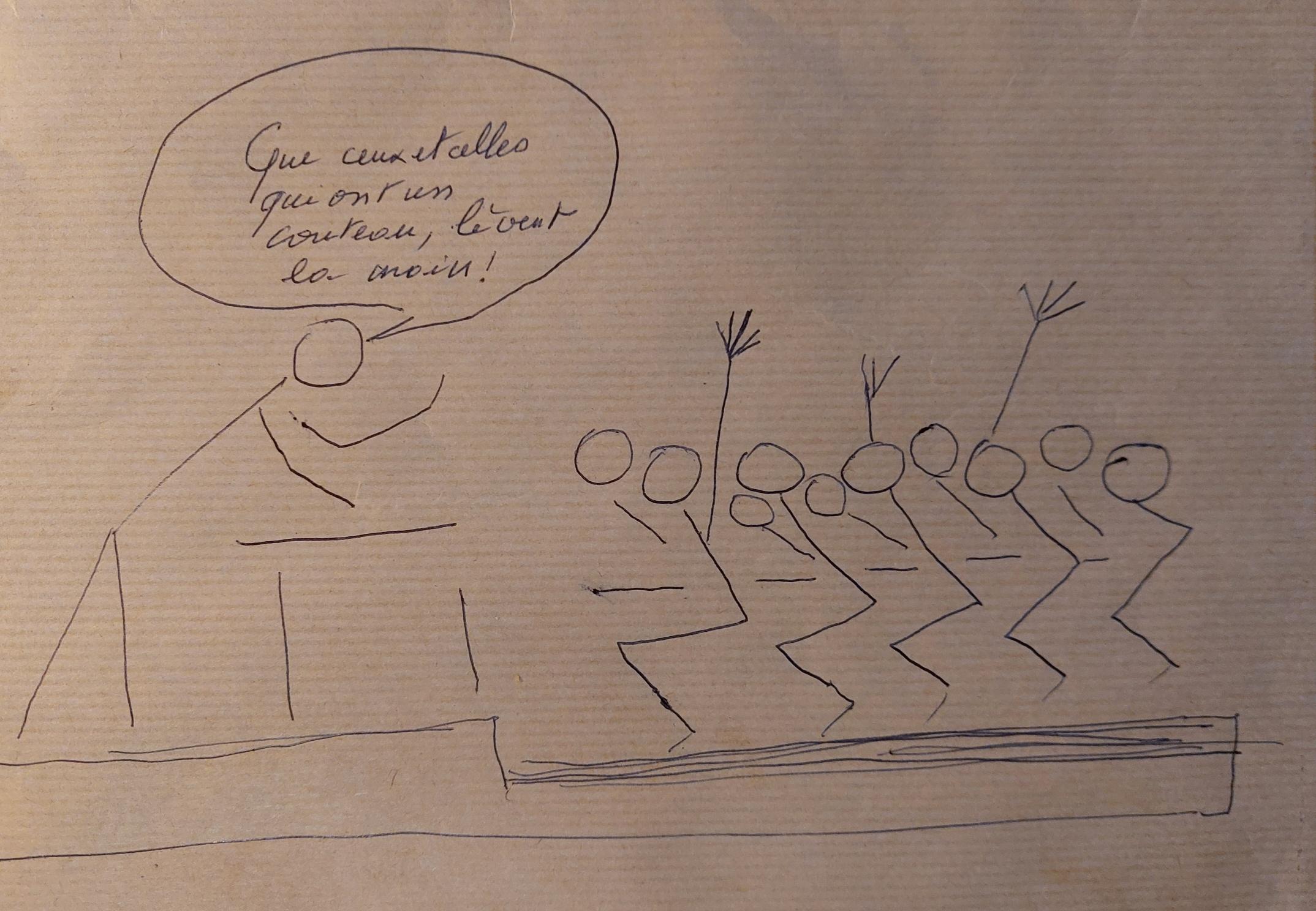 Dessin de merde au stylo  en "bonhommes batons" ( du plus pur style "l'autrice a pris ses cours de dessin en griffonnant pendant les conseils de classe" ): un professeur debout derrière son bureau s’adresse à une classe. Dans une bulle, il dit : « Que ceux et celles qui ont un couteau lèvent la main ! ». En face de lui, plusieurs élèves schématiques, assis, lèvent le bras.