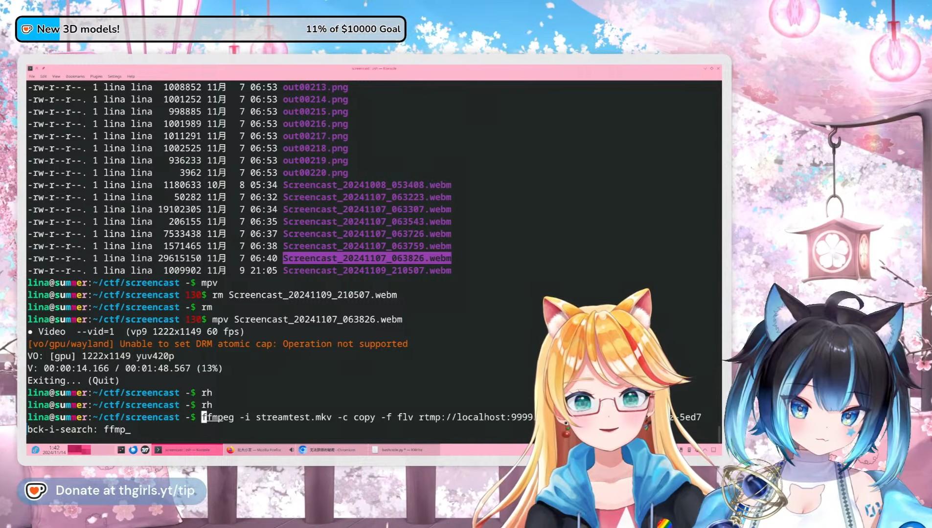 ![Screenshot of a stream with Cyan and Lina. The screen shows a terminal with an ffmpeg command configured to output to RTMP to localhost [which was forwarded to YouTube]. Lina's head neatly covers almost the entire stream key.](https://media.vt.social/media_attachments/files/116/017/472/849/188/737/original/254f0d672ba8f661.jpg)