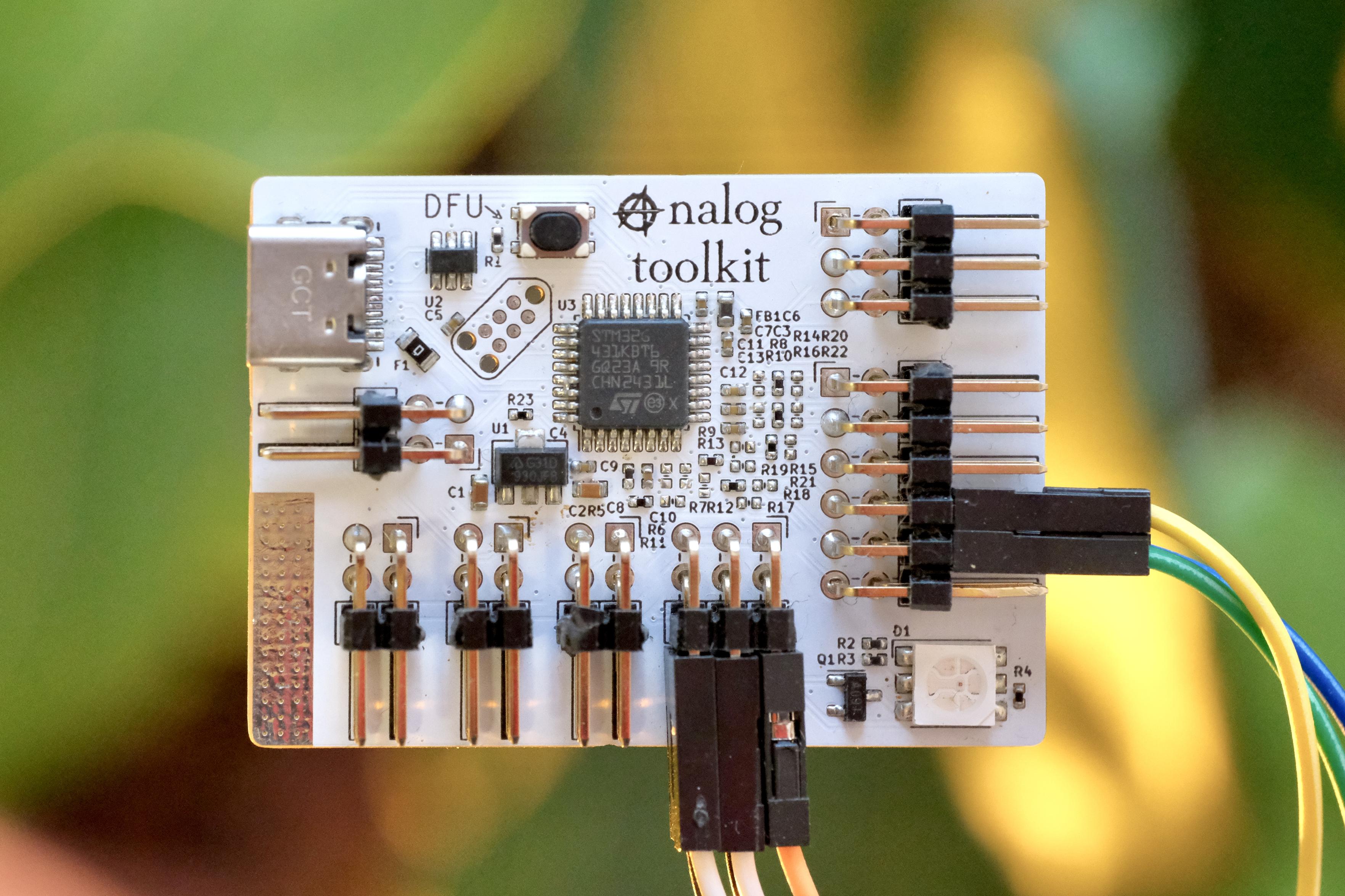 A photo of a white rectangular pcb with a lot of pinheaders extruding to all sides. To the left a USB receptacle sits on the board. A bunch of colourful cables leave the image to the right. The board says “analog-toolkit”