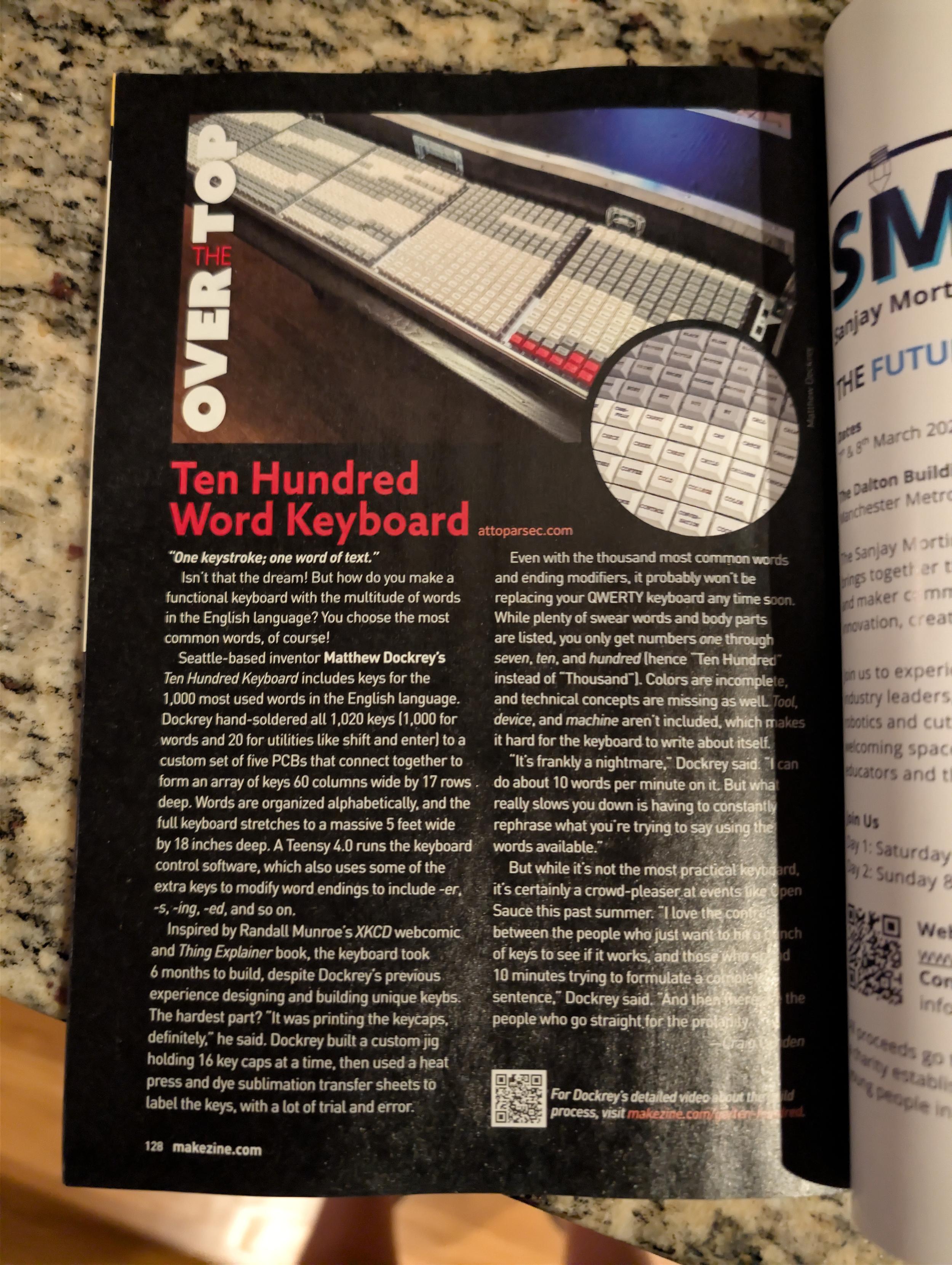 ![A full page of Make magazine, with a picture of the Ten Hundred Keyboard up top and the following text: