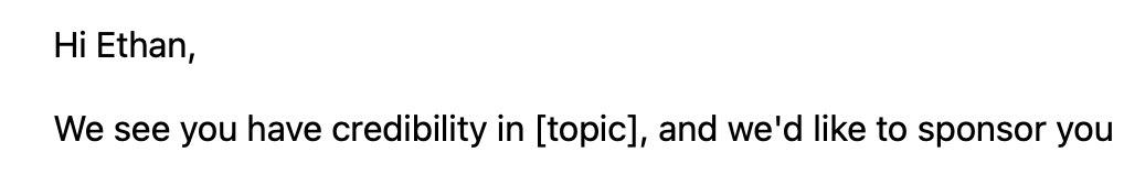 ![Screenshot of an email that begins, “Hi Ethan, We see you have credibility in [topic], and we’d like to sponsor you.” (“Topic” is set off with square brackets, suggesting that it was supposed to be replaced with something else before sending. Yeah, I know.)](https://cdn.masto.host/followethanmarcottecom/media_attachments/files/116/087/799/582/953/970/original/a06f3ac2de49a25b.jpeg)