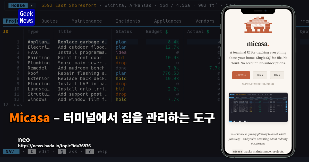 Micasa – 터미널에서 집을 관리하는 도구 ------------------------------ - *주택 유지보수와 프로젝트, 가전, 견적, 문서* 를 한 곳에서 관리할 수 있는 터미널 기반 애플리케이션 오픈소스 - *정비 일정, 서비스 이력, 보증 상태* 등을 자동 계산해 표시하며, 모든 데이터는 *SQLite 파일 하나* 에 저장 - *Vim 스타일 키보드 조작* 으로 탐색·편집·검색이 가능하고, 관련 항목 간의… ------------------------------ https://news.hada.io/topic?id=26836&utm_source=googlechat&utm_medium=bot&utm_campaign=1834