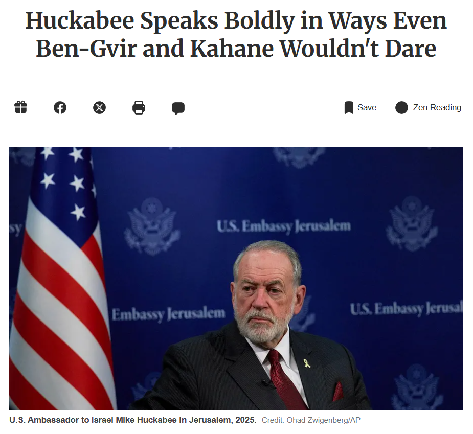 U.S. Ambassador to Israel Mike Huckabee in Jerusalem, 2025. Credit: Ohad Zwigenberg/AP](https://cdn.theblower.au/media_attachments/files/116/117/894/045/202/193/original/82bd5eb5a4b11f7d.png)