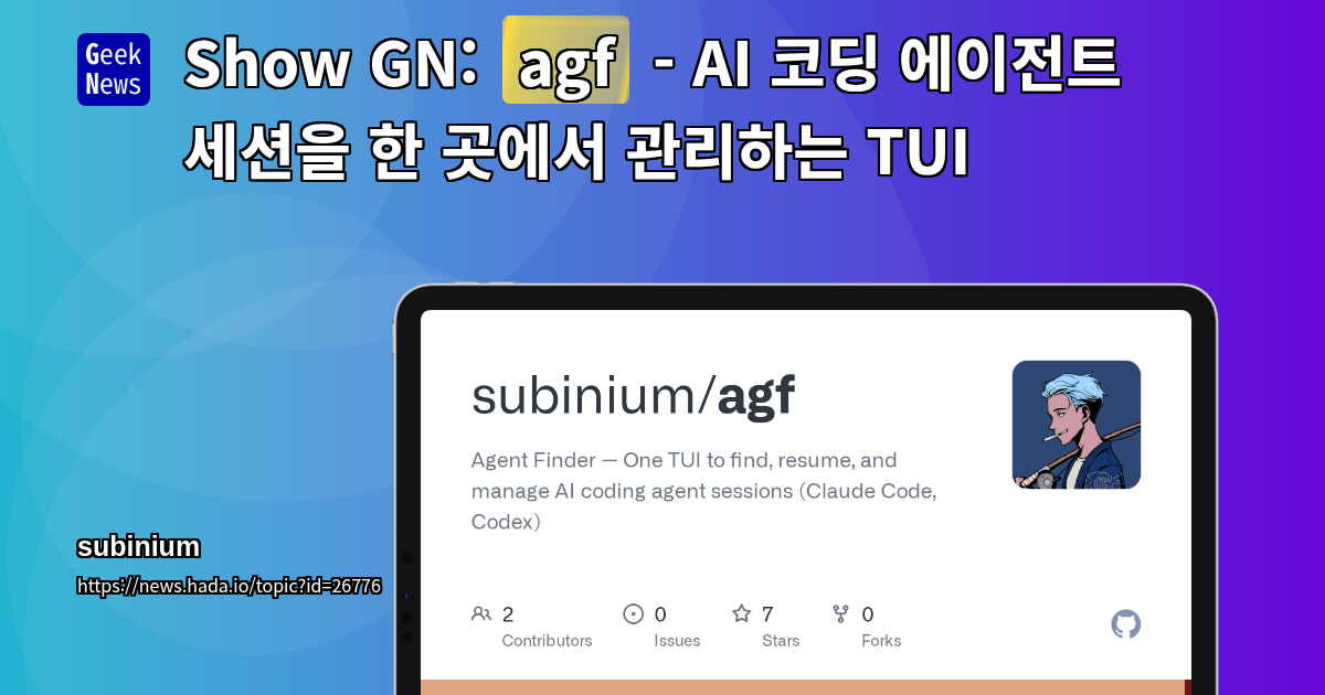 Show GN: agf - AI 코딩 에이전트 세션을 한 곳에서 관리하는 TUI