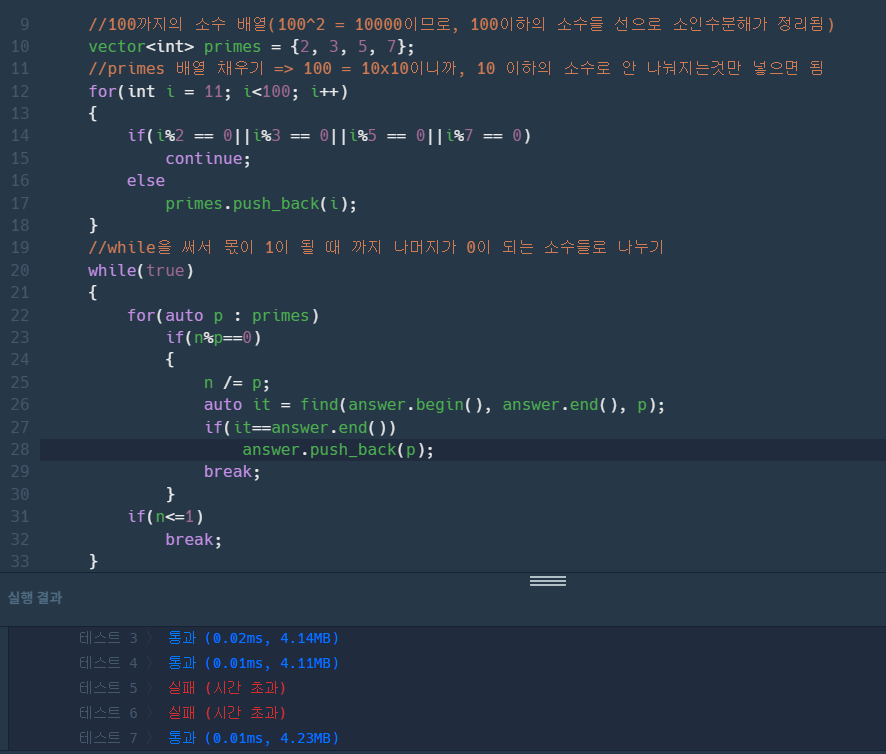 28일차 2월 마지막 문제라고 보스전인가? 오랜만에 난이도 있는 문제..! 사실 최근 미야님의 조언과 소수 거르는 채 사용법을 제대로 익힐 수 있었던 영상을 보았어서, 자신만만했는데요. ..시간 초과가 떠 버리네.. 음... 어떻게 해야 시간 초과가 안 되게 만들 수 있는거지..
