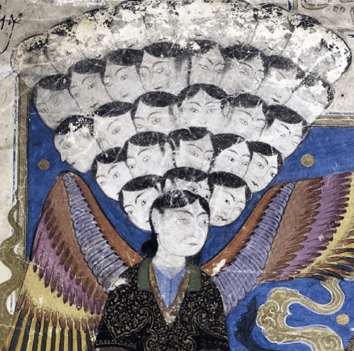 The illustration from folio 34v of the Mirajnameh depicts a monumental celestial being encountered by the Prophet Muhammad during his nocturnal journey. Characterized by multiple tiers of human heads emerging from a single set of shoulders, the figure represents an angel of immense proportions and linguistic capacity. According to the accompanying text, the angel possesses seventy heads, each equipped with seventy tongues, allowing it to praise the Divine in seventy thousand different languages simultaneously.