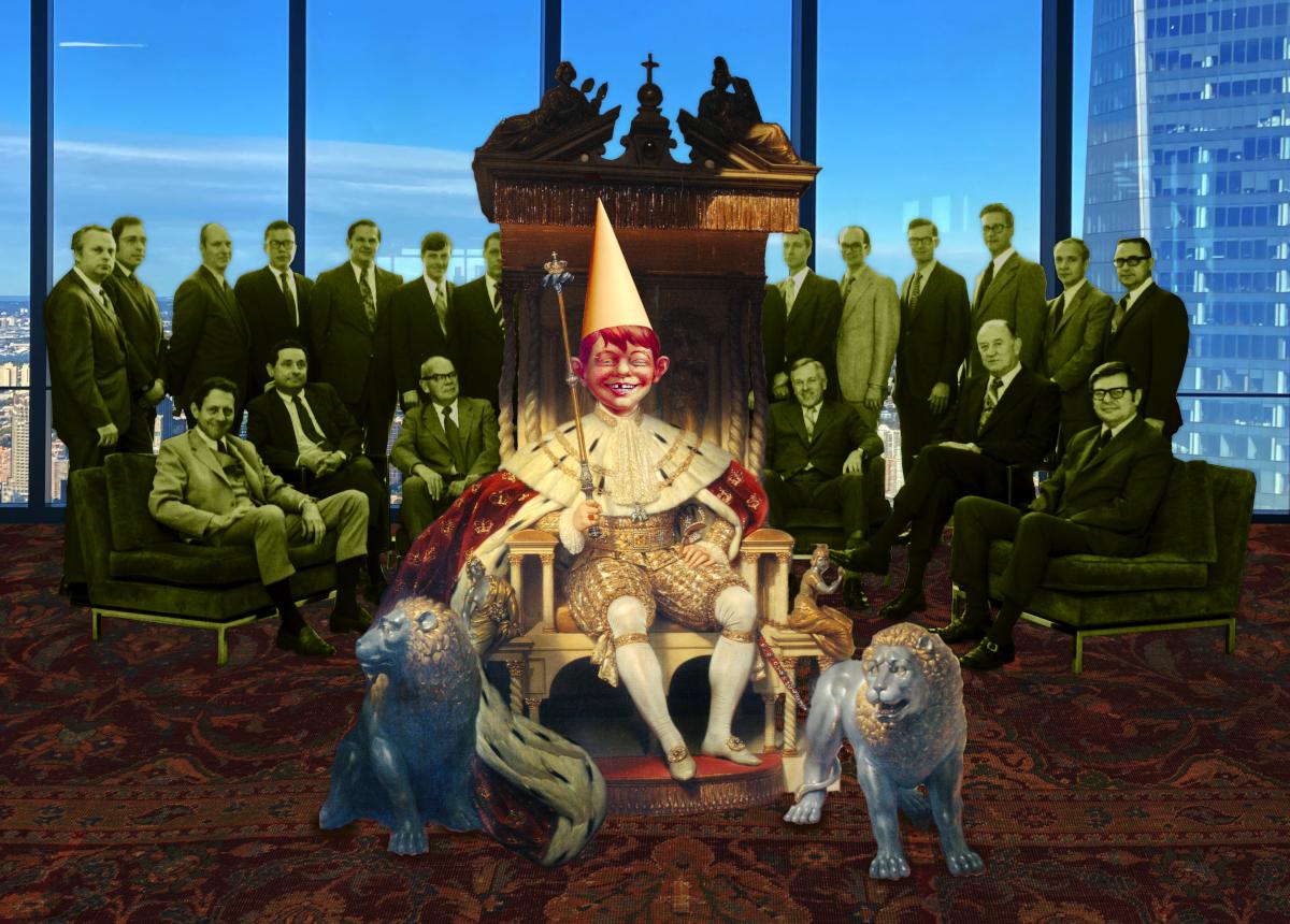 A king on a sumptuous, much elaborated throne; in one hand he holds a sceptre of office, in the other, the leashes for two fierce stone dogs that guard the throne. The king's head has been replaced with a character who was used as the basis for MAD Magazine's Alfred E Neumann. The new head sports a conical dunce cap. Behind the king is a large group of 1960s business men, seated and standing, in conservative suits. The background is the view from the 80th floor of World Trade Center 3. The floor has been carpeted in sumptuous tabriz from the Ottoman court.