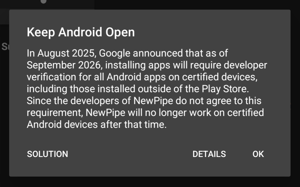 구글이 올해 9월부터 인증된 기기에 설치되는 앱은 플레이스토어 내외에 관계없이 개발자 인증을 강제한다고 한 것에 대해 뉴파이프는 그럼 못 쓰는거지 뭐 라고 대응하기로 했나 보네요.