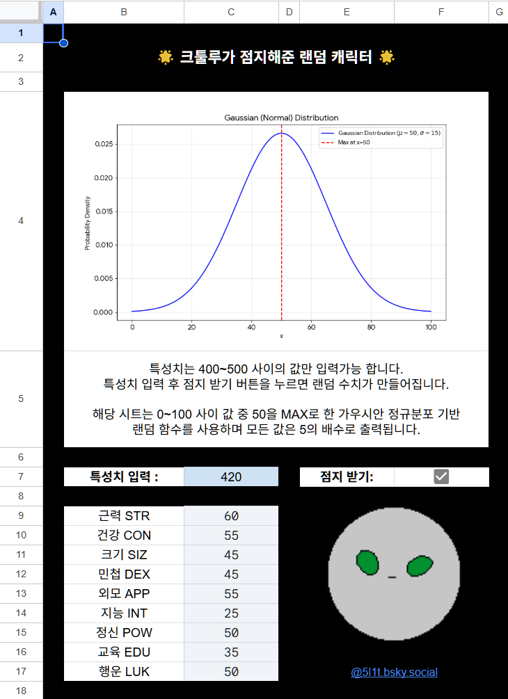 번개탁을 위한 크툴루가 점지해준 랜덤 캐릭터 만들기 시트를 배포합니다. 특성치 입력값에 맞게 스탯이 자동분배되며, 50을 첨두로 한 정규분포를 따르는 랜덤함수를 사용했습니다. 따라서 진짜 이상한 수치가 나오면 그것은 당신의 개쩌는 운임을 기억하십시오... 파일>사본만들기 로 가져가시면 됩니다. docs.google.com/spreadsheets...