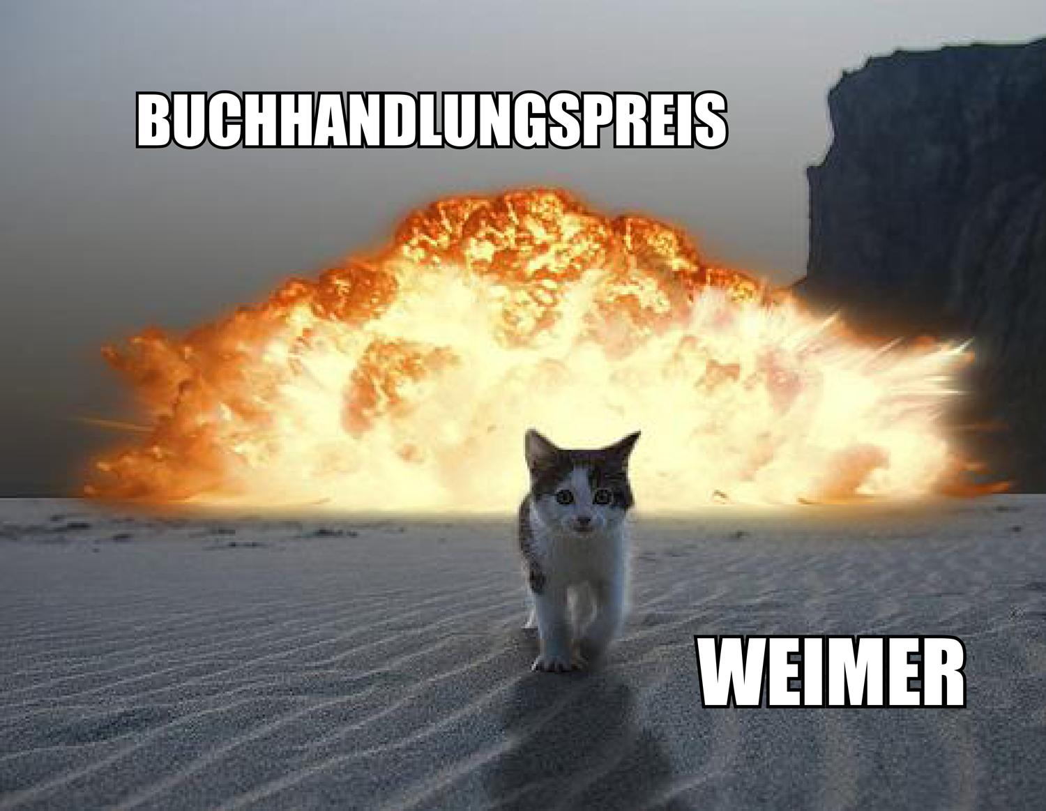 Katze geht von einer Feuerball-Explosion im Hintergrund weg. Daneben stehen die Begriffe »Weimer« und »Buchhandlungspreis«. Ihr wisst wo.