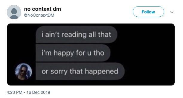 ![On December 16th, 2019, Twitter account @nocontextdms[1] posted a screenshot of a person with a Cyberpunk 2077 Keanu Reeves avatar writing, "I ain't reading all that. I'm happy for u tho. Or sorry that happened." The post gained over 23,000 retweets and 100,000 likes before the account was suspended.](https://media.infosec.exchange/infosec.exchange/media_attachments/files/116/230/407/636/782/132/original/8e46f726f806efcc.jpg)