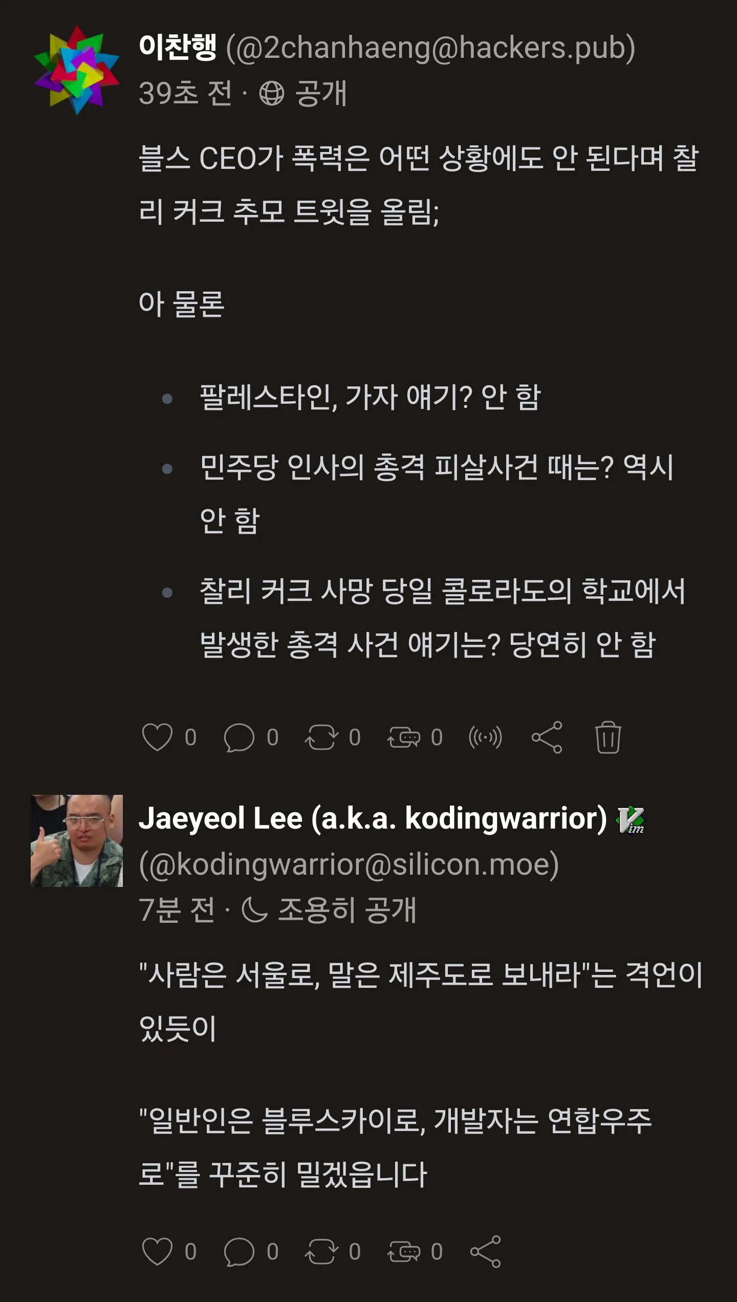 - 찰리 커크 사망 당일 콜로라도의 학교에서 발생한 총격 사건 얘기는? 당연히 안 함